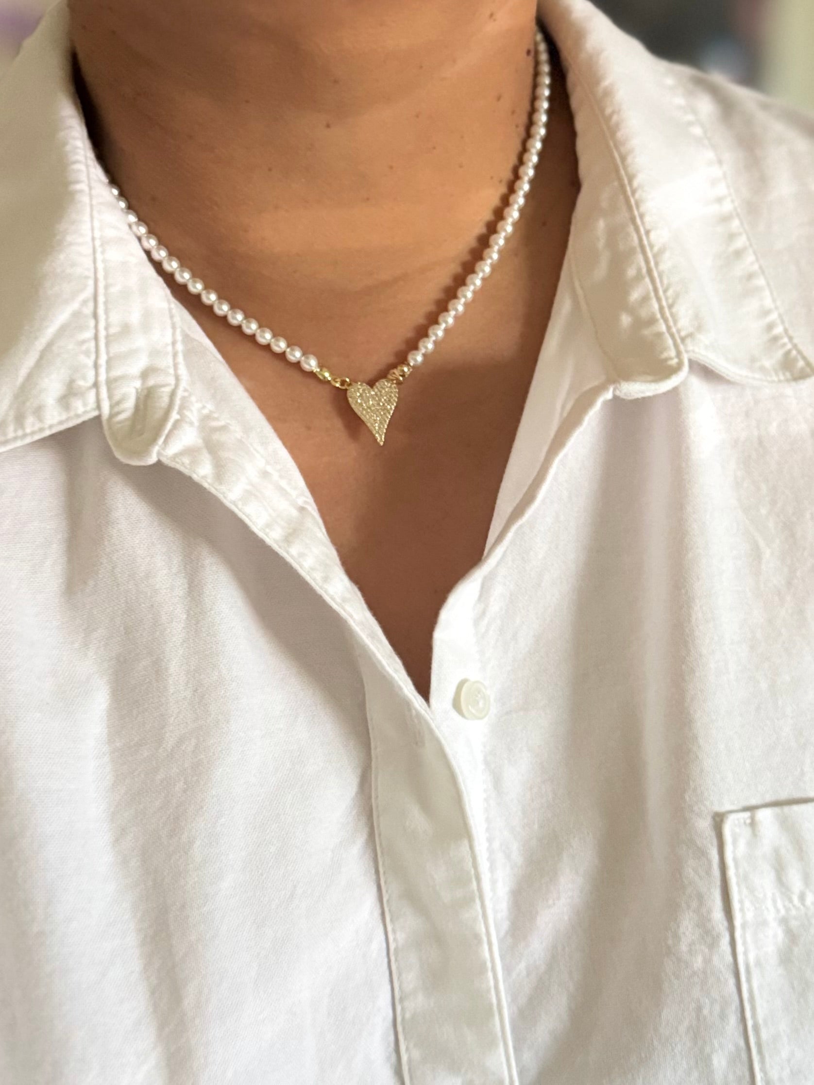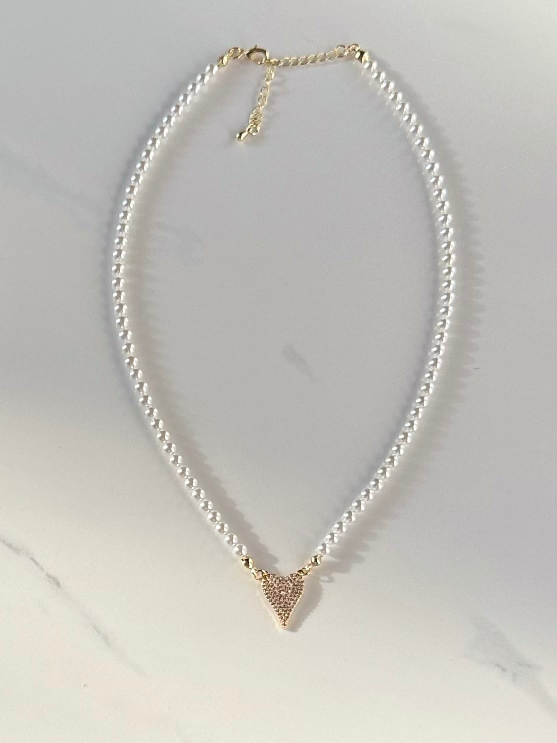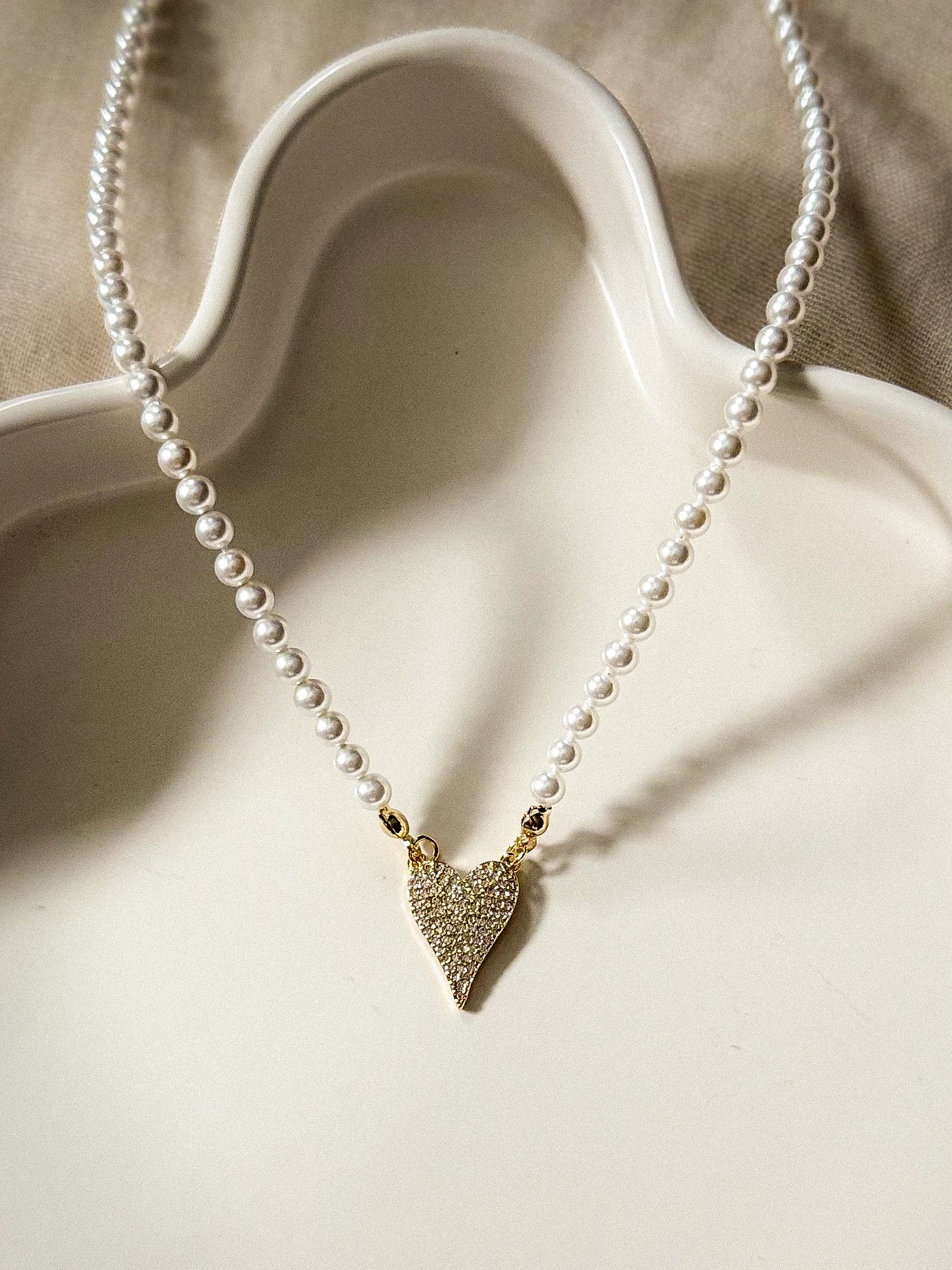 Elevate your style with Adele, a playful yet sophisticated necklace. Adorned with dainty mother of pearl beads and a sparkling pave heart, its two strands are elegantly connected. Add a touch of luxury to any outfit with this exclusive piece.