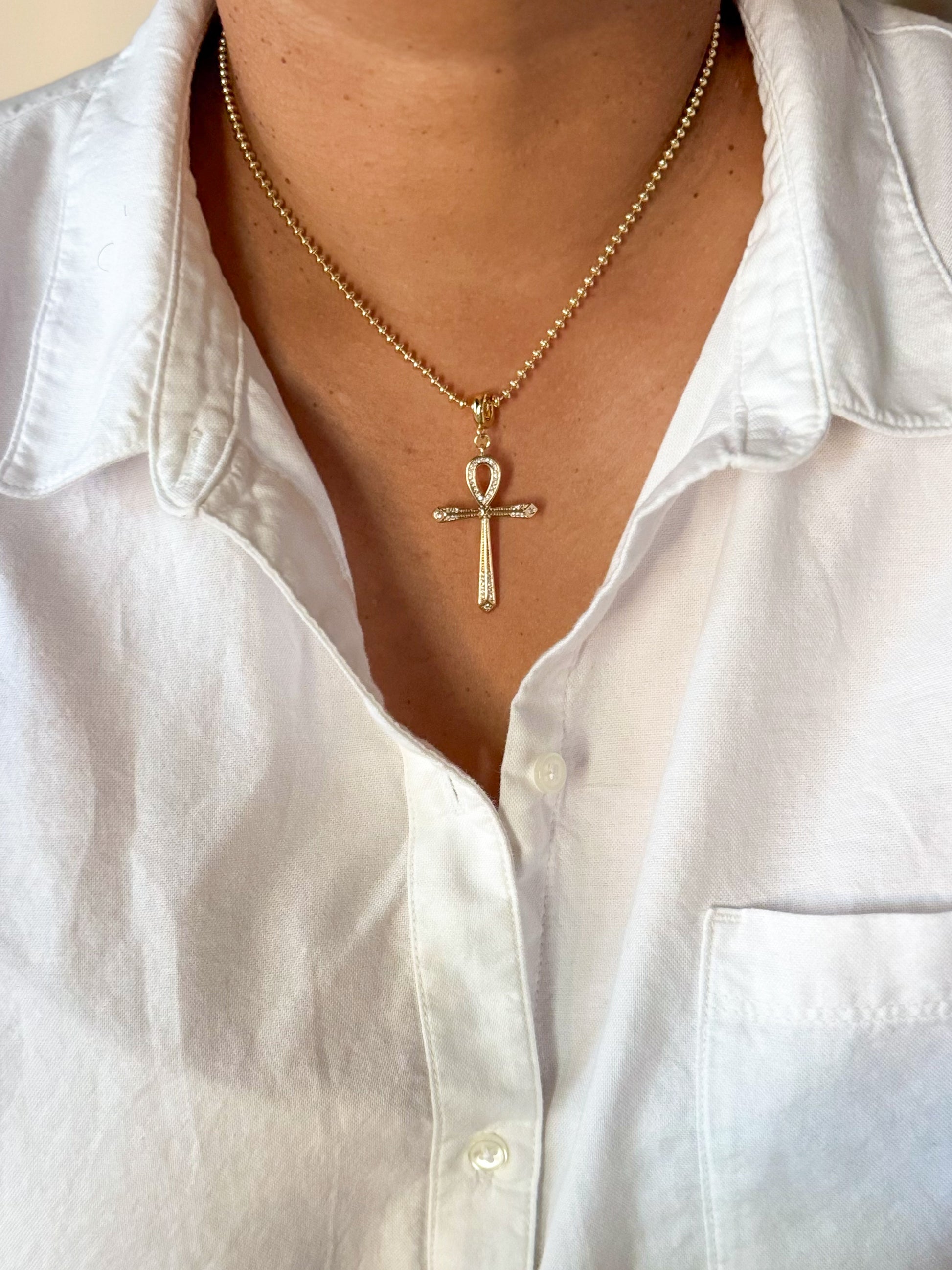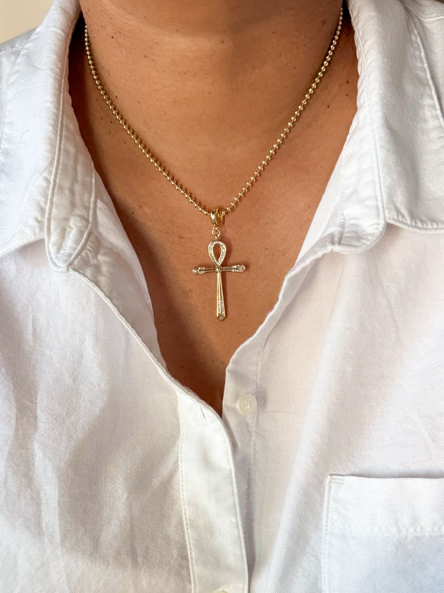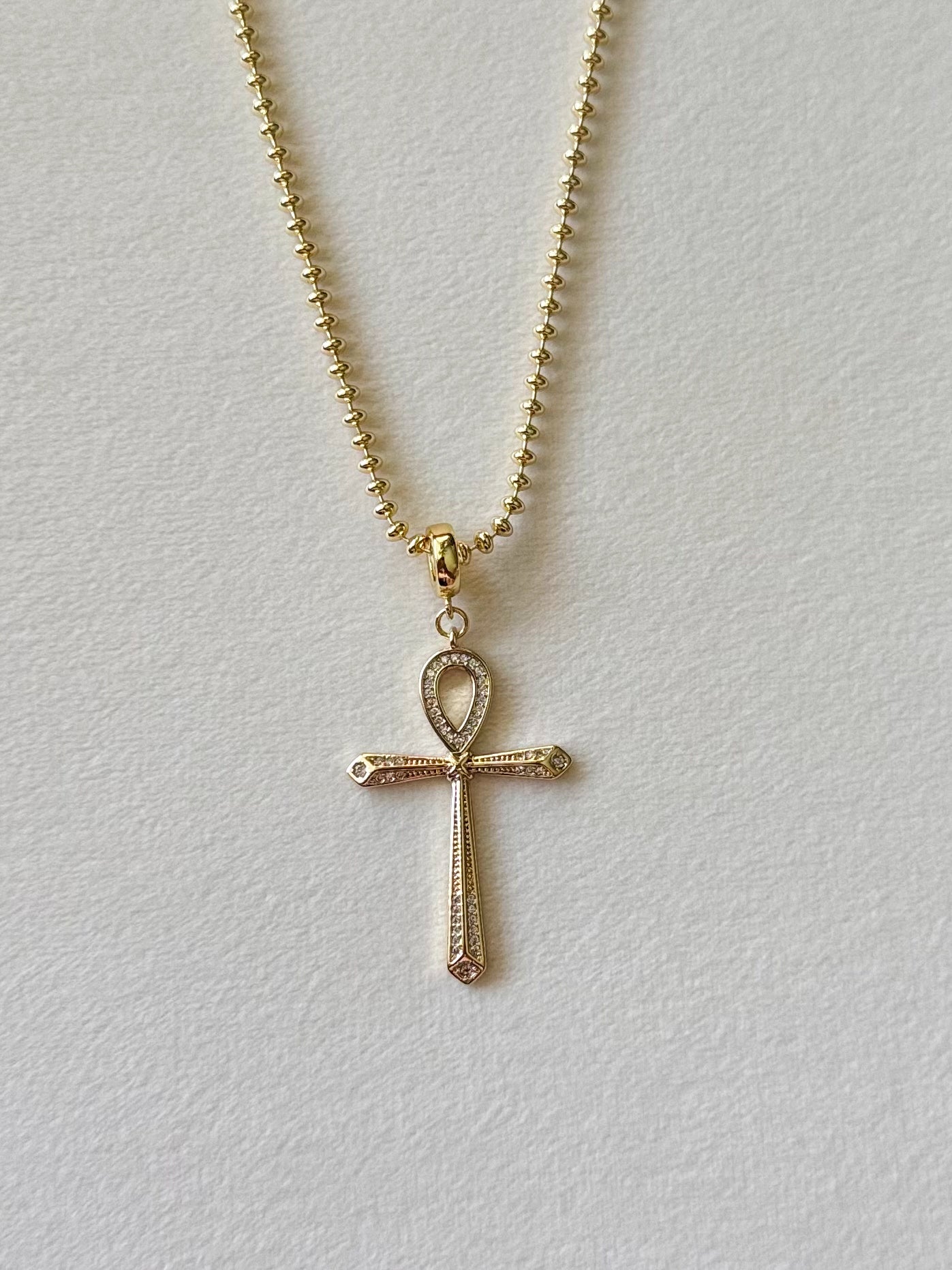 Elevate your style with our Ankh necklace. Featuring a stunning beaded chain and a sparkling pave ankh charm, this necklace is the epitome of luxury. Channel the rich history and symbolism of the ankh while adding a touch of elegance to any outfit. Elevate your look today.