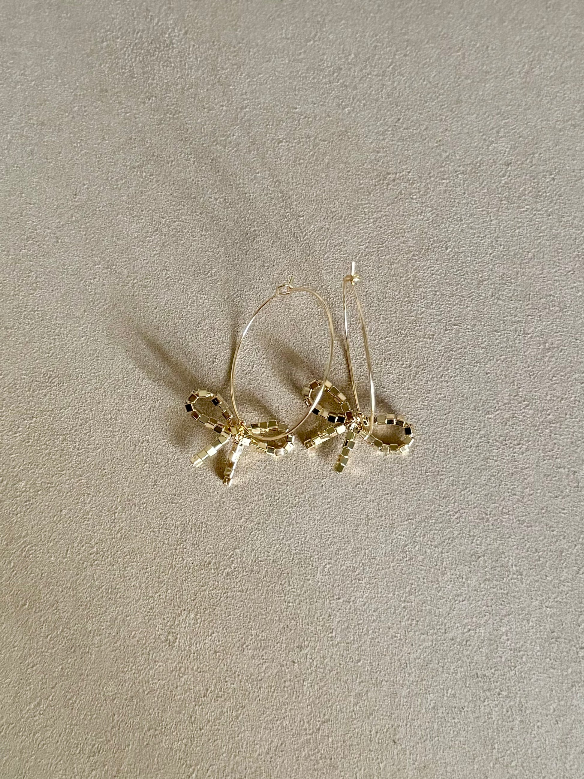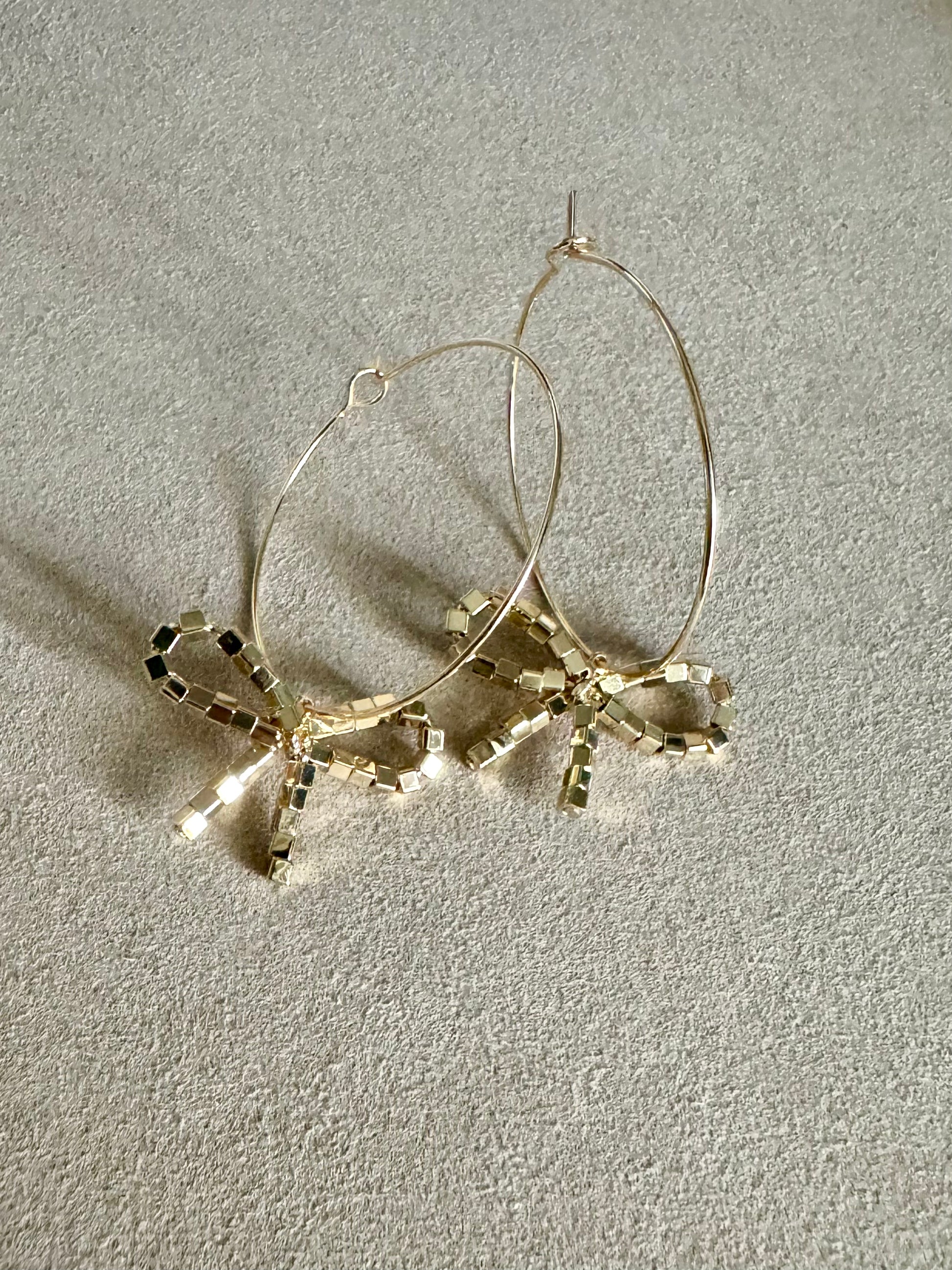 Adorn your lobes with our Beaded Bow hoops - delicately crafted with tiny gold beads arranged in a bow design on a dainty wire hoop. Elevate your style with these charming earrings that are both elegant and playful. A must-have addition to your jewelry collection!