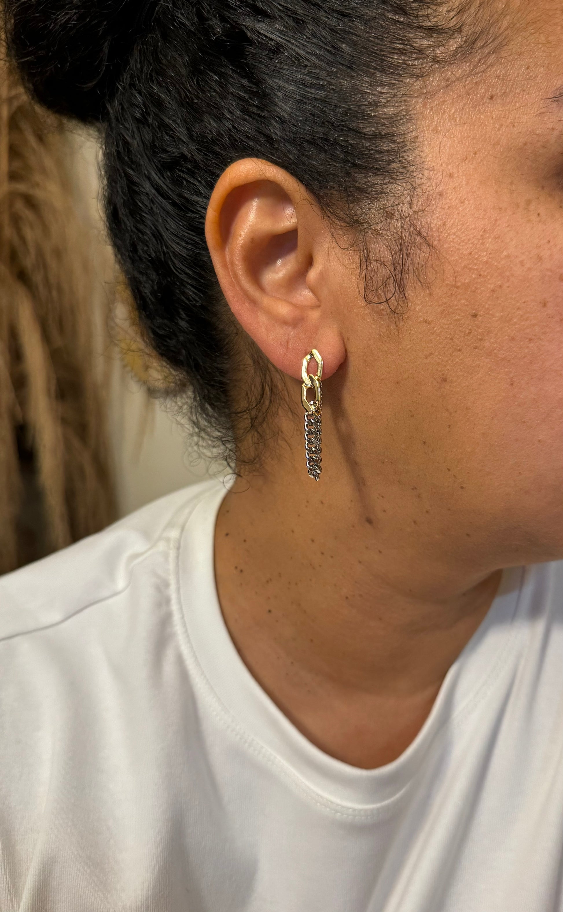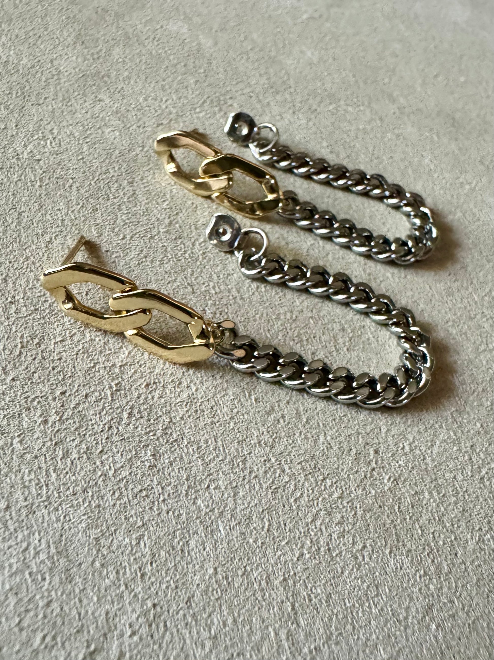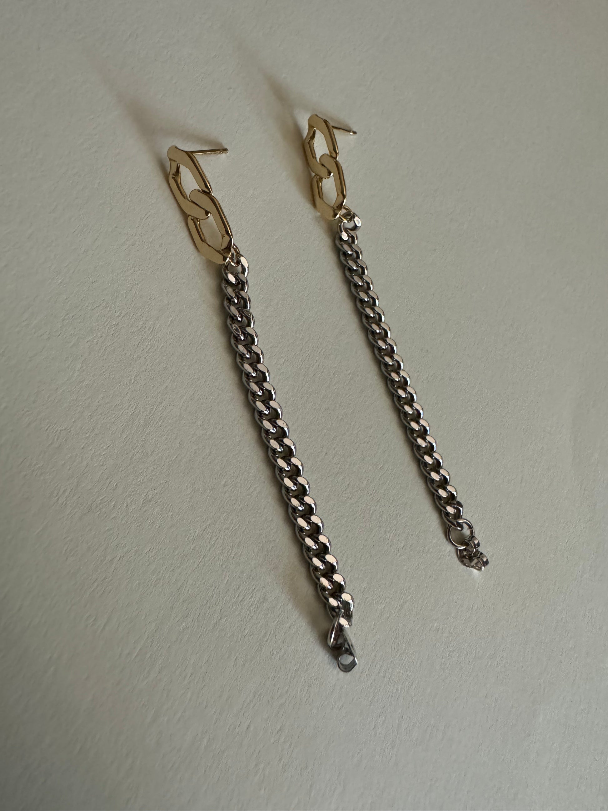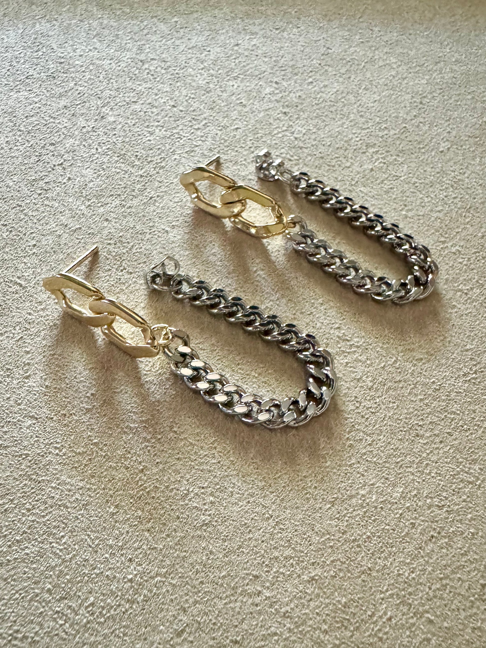 These unique chain link earrings showcase a Figaro and curb chain design, adding a touch of elegance to your outfit. Made with silver and gold metals, they make a statement and add versatility to your jewelry collection. Elevate your style with this special piece.