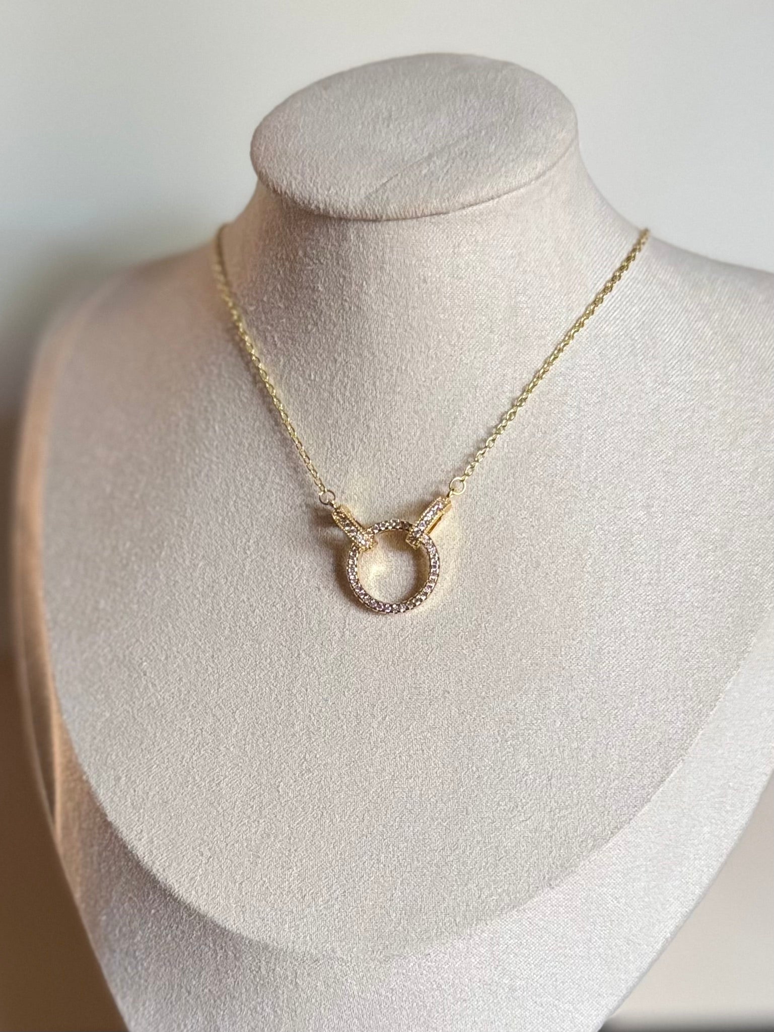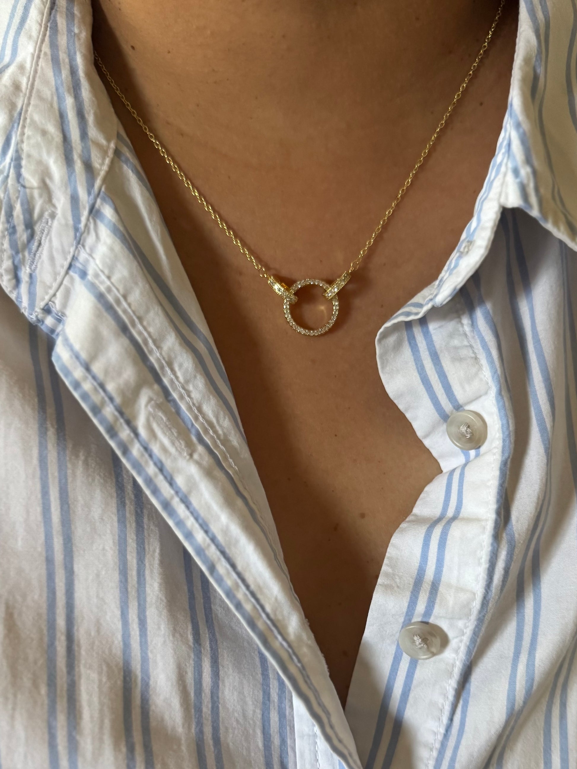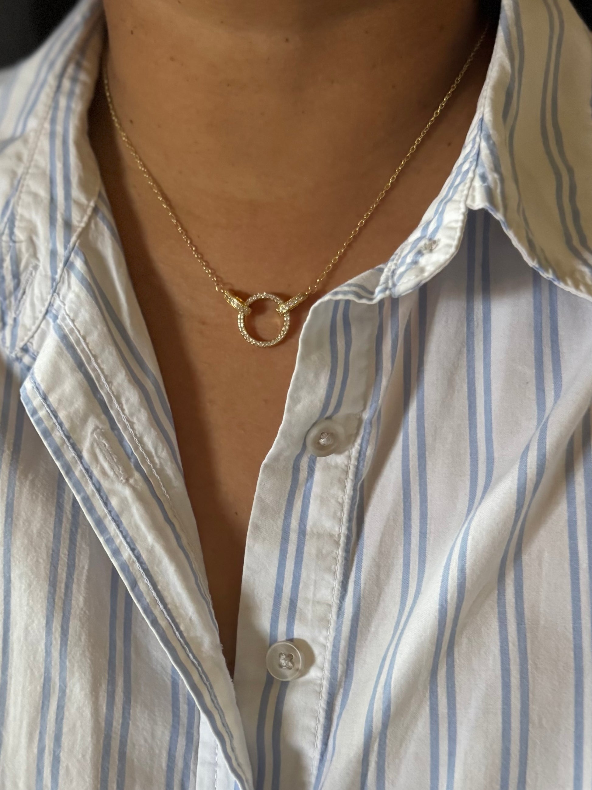 Meet Claire - a dainty necklace that radiates posh vibes. Adorned with a circle pave charm and connectors, it's perfect for adding a touch of elegance to any outfit. Treat yourself or a loved one to this charming accessory.
