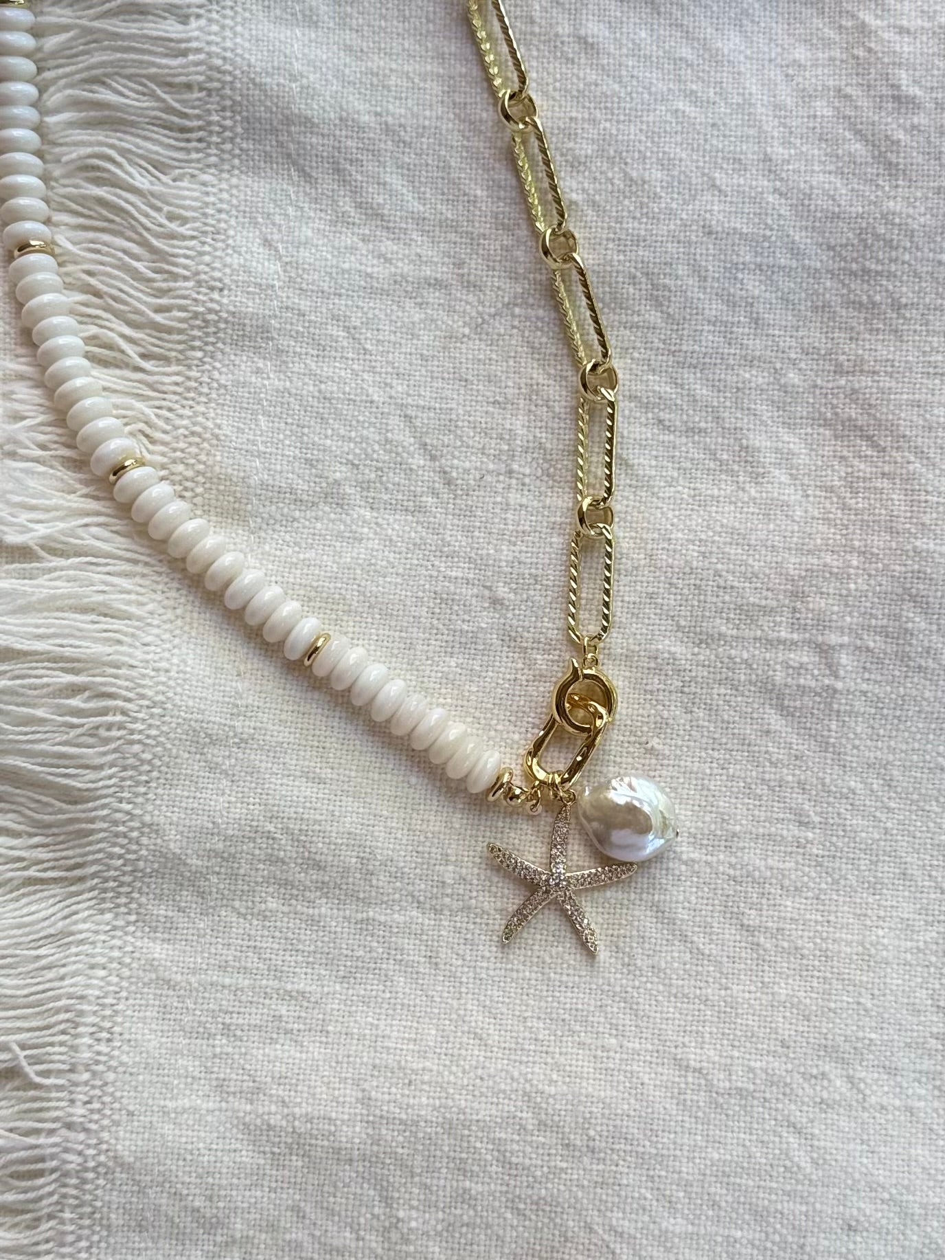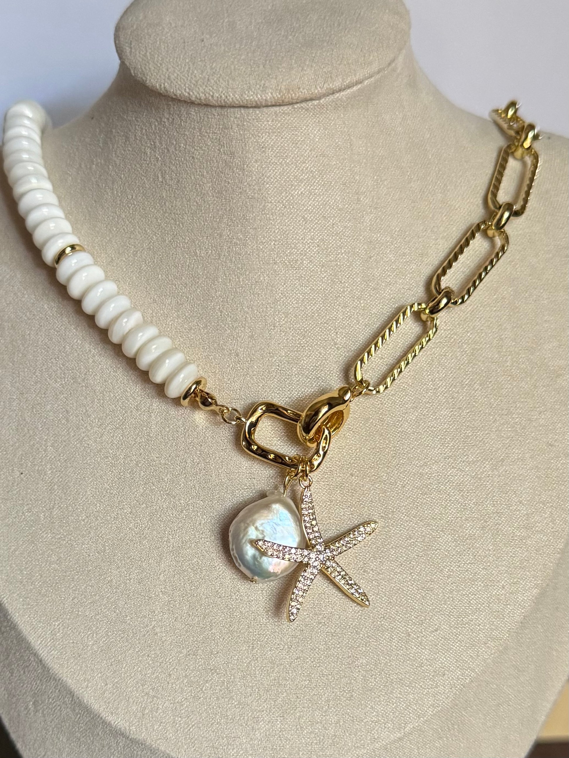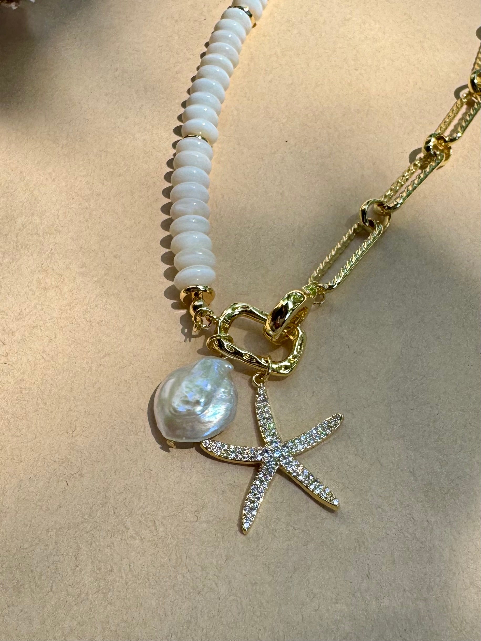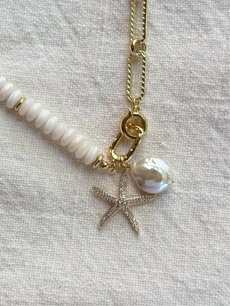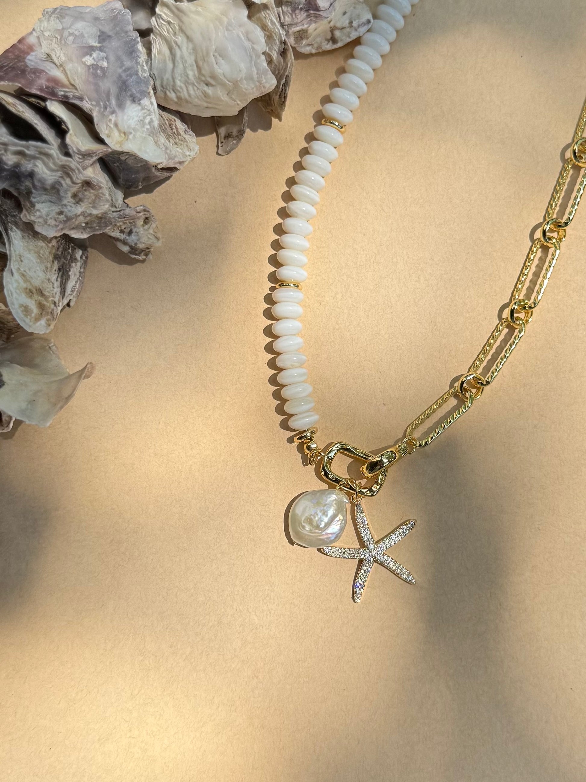 Adorned with sparkling blinged out starfish and delicate freshwater coin pearl charm, this double-strand necklace features a combination of gold plated chain and white lip shell for a truly elegant and unique look. Elevate your beach style!