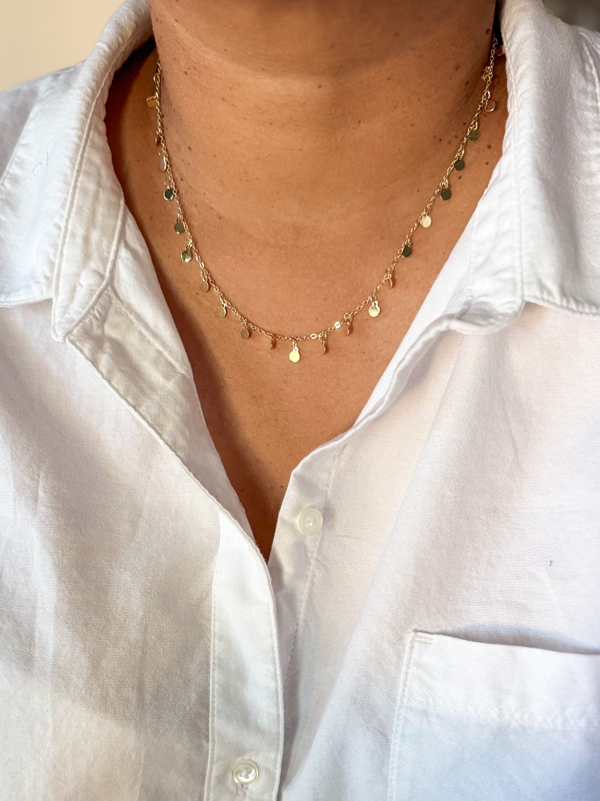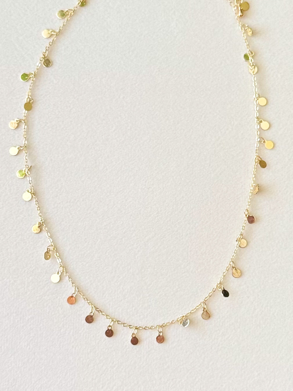 Indulge in understated elegance with our Confetti necklace. This dainty, shimmery piece features tiny gold charms that reflect light with every move, adding a touch of sophistication to any outfit.