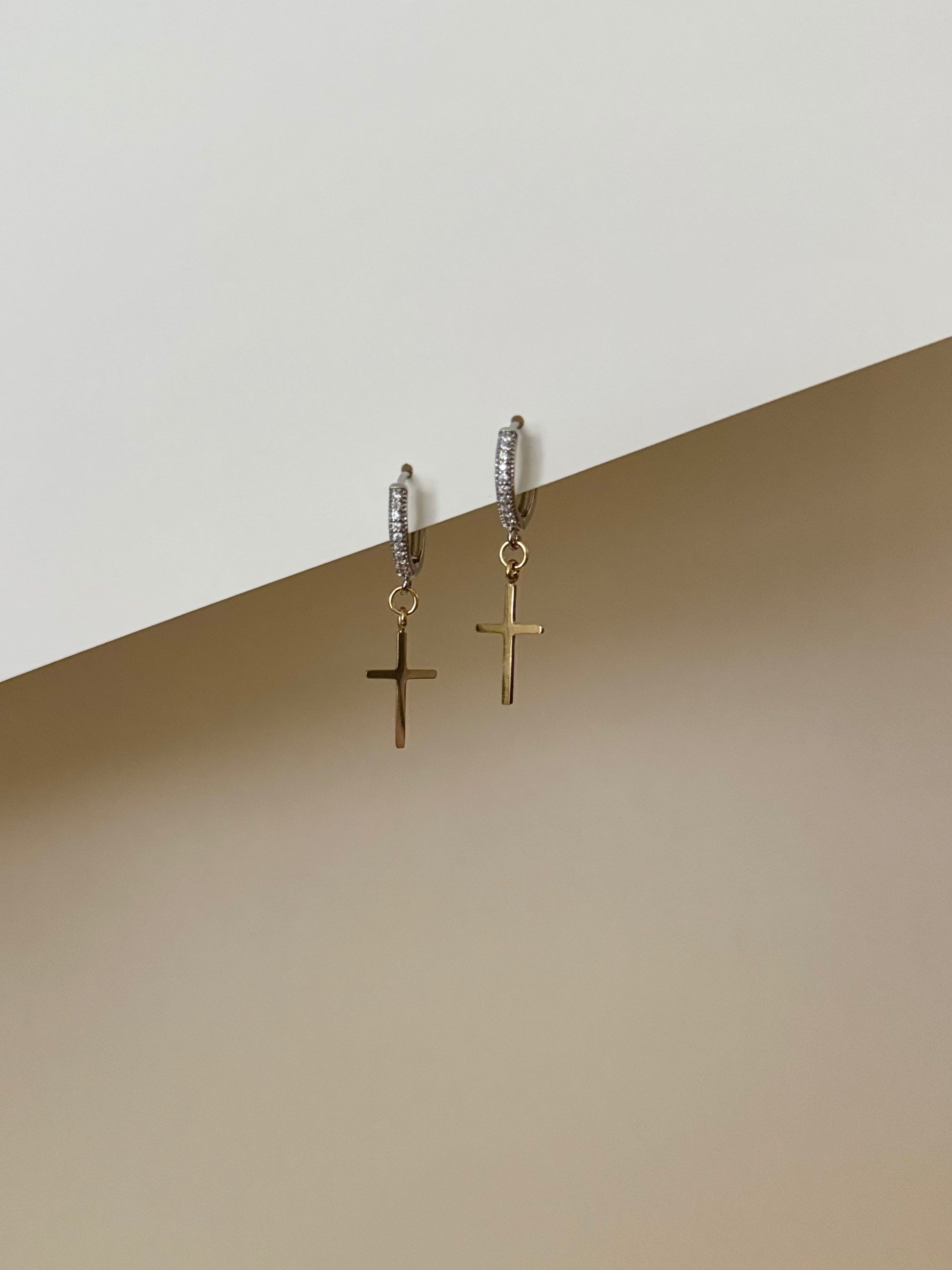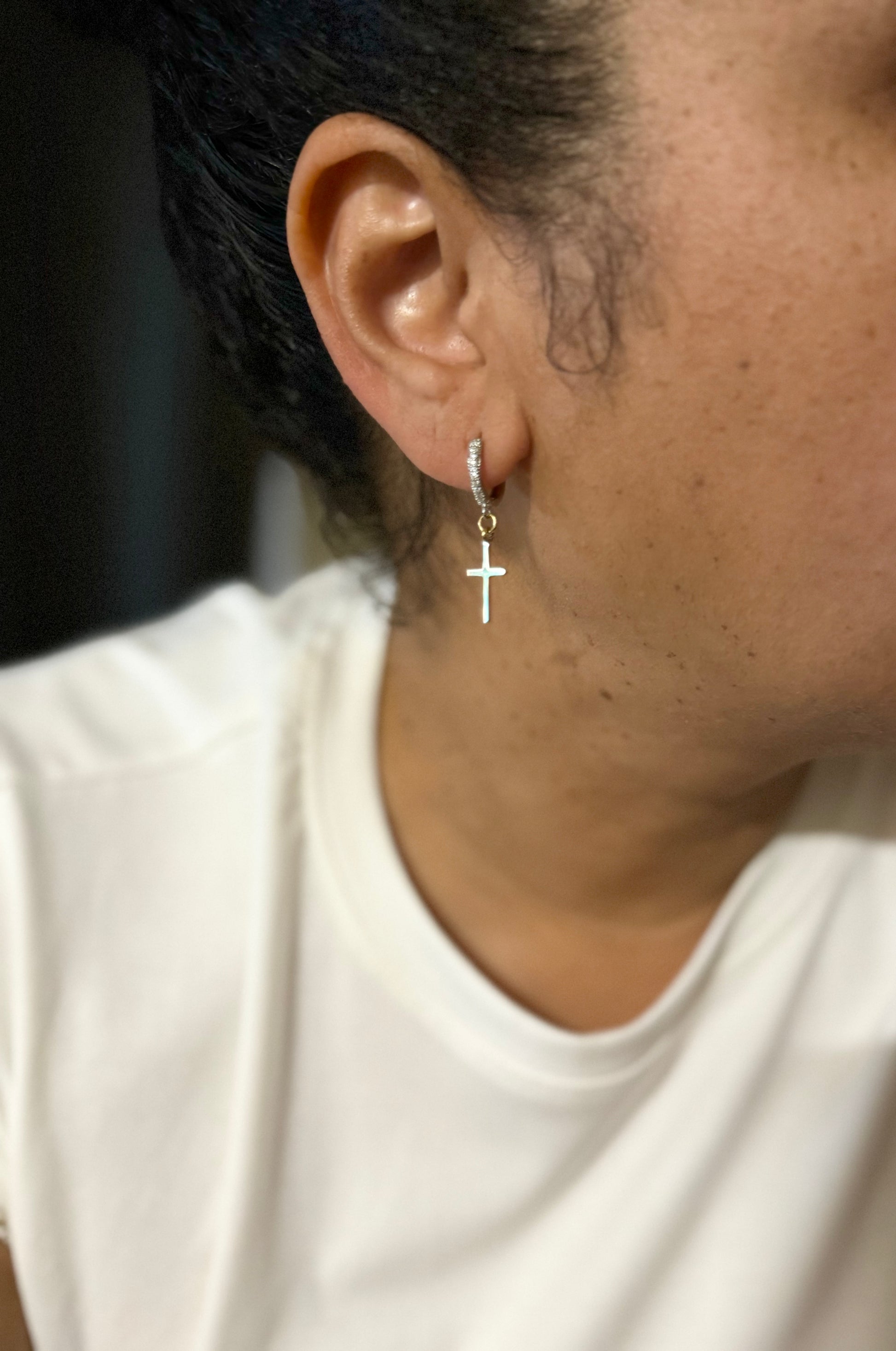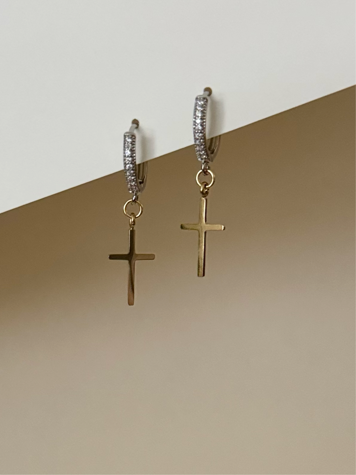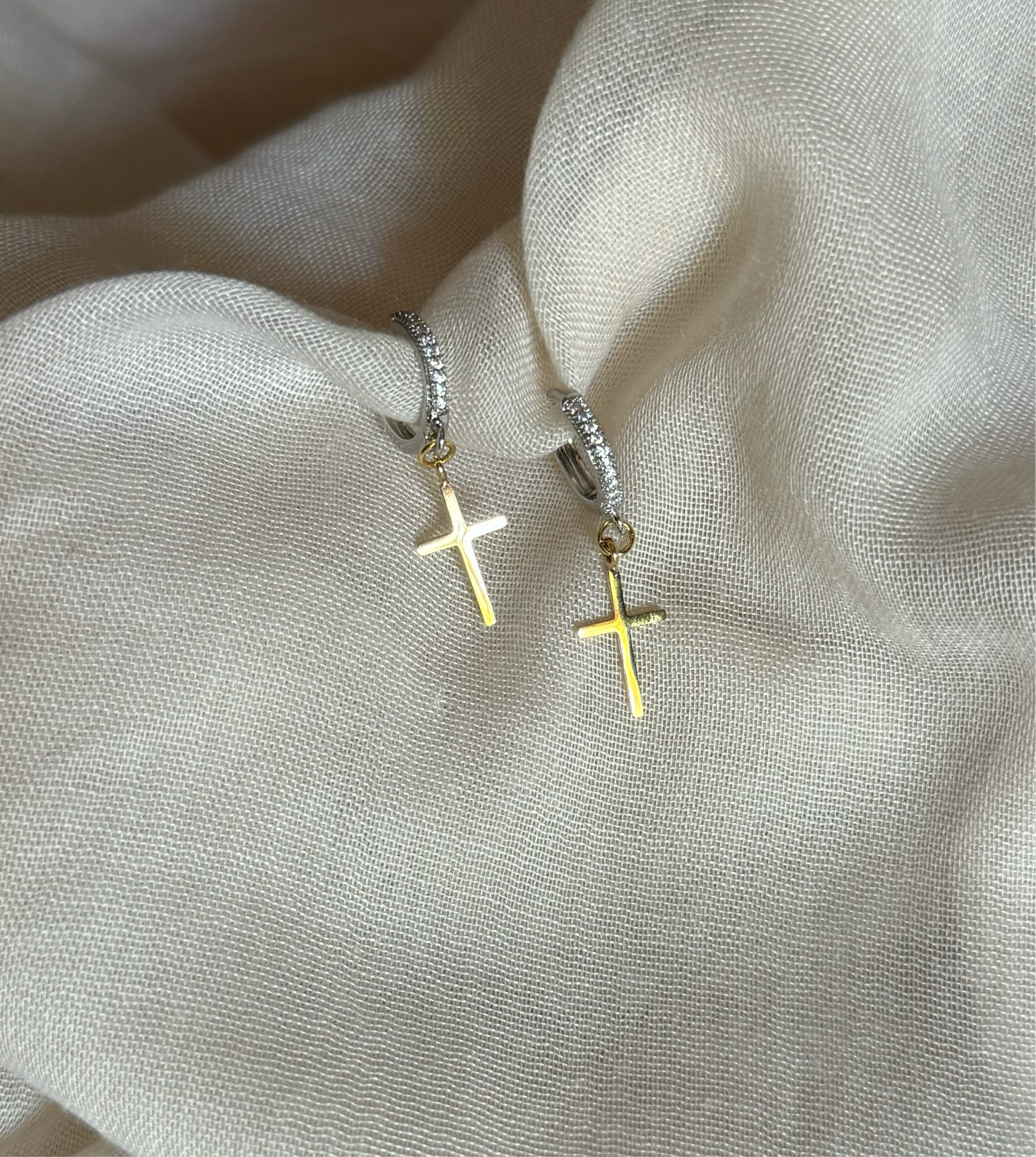 Add a unique twist to your daily look with Cross Huggies. Featuring a dainty gold cross charm on a silver Huggy, these earrings combine silver and gold for a one-of-a-kind style. Perfect for everyday wear, these earrings are both classy and versatile.