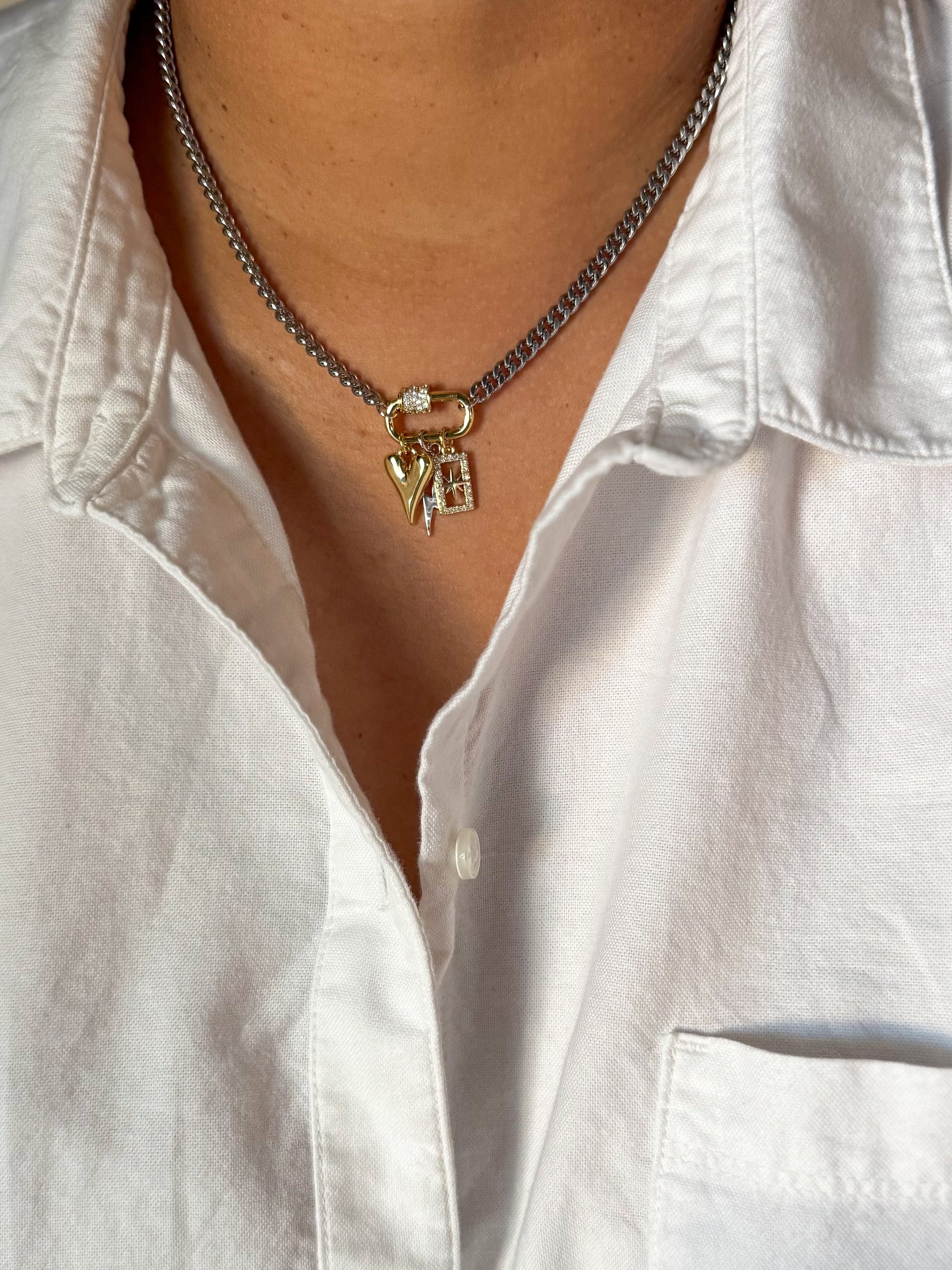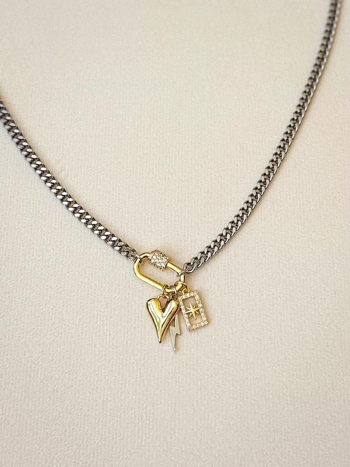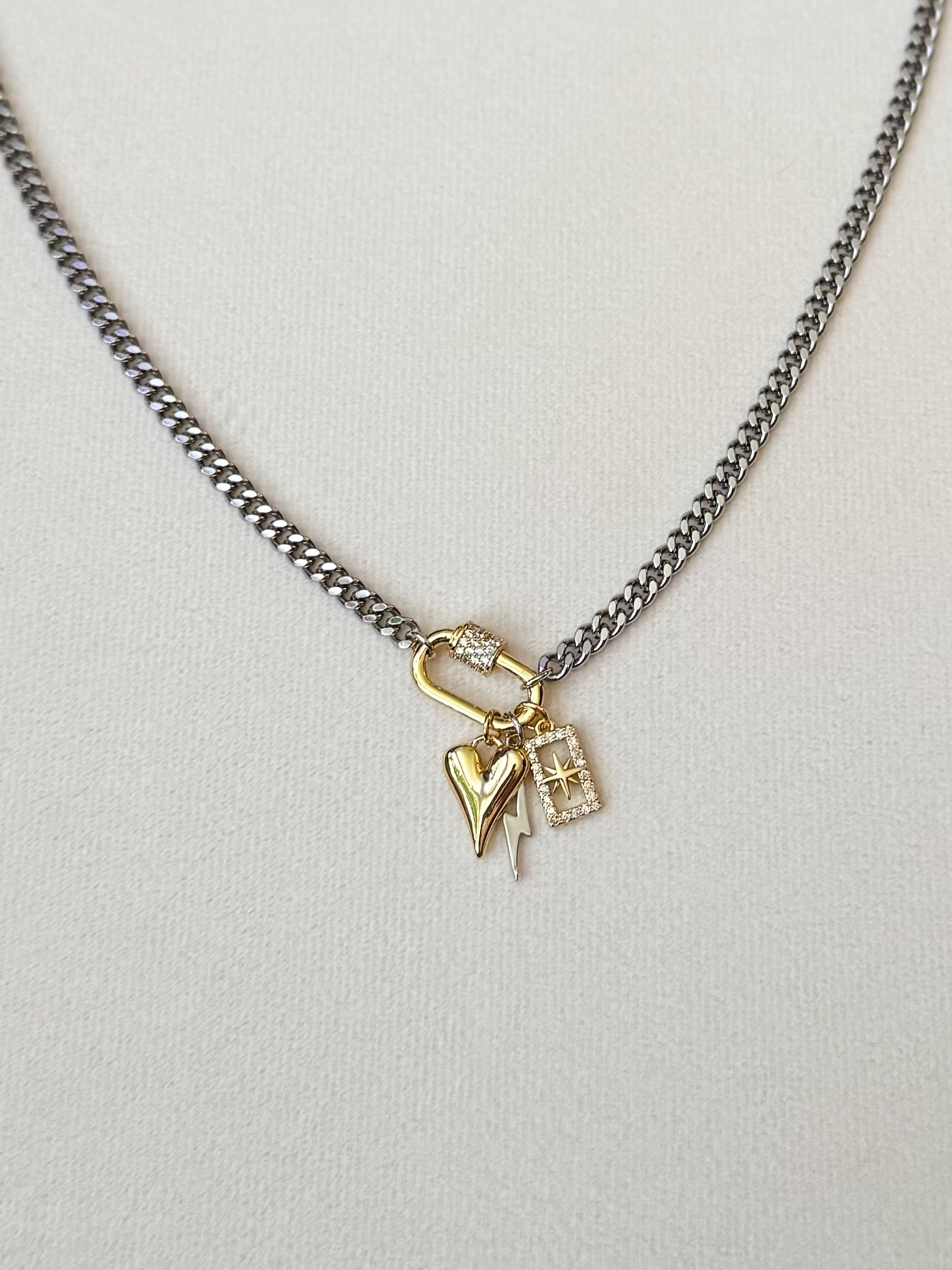 Add some sparkle to your look with our Desire mixed tone necklace. This unique necklace features a combination of silver and gold tones, with three playful charms – a gold heart, a gold framed star, and a silver bolt.