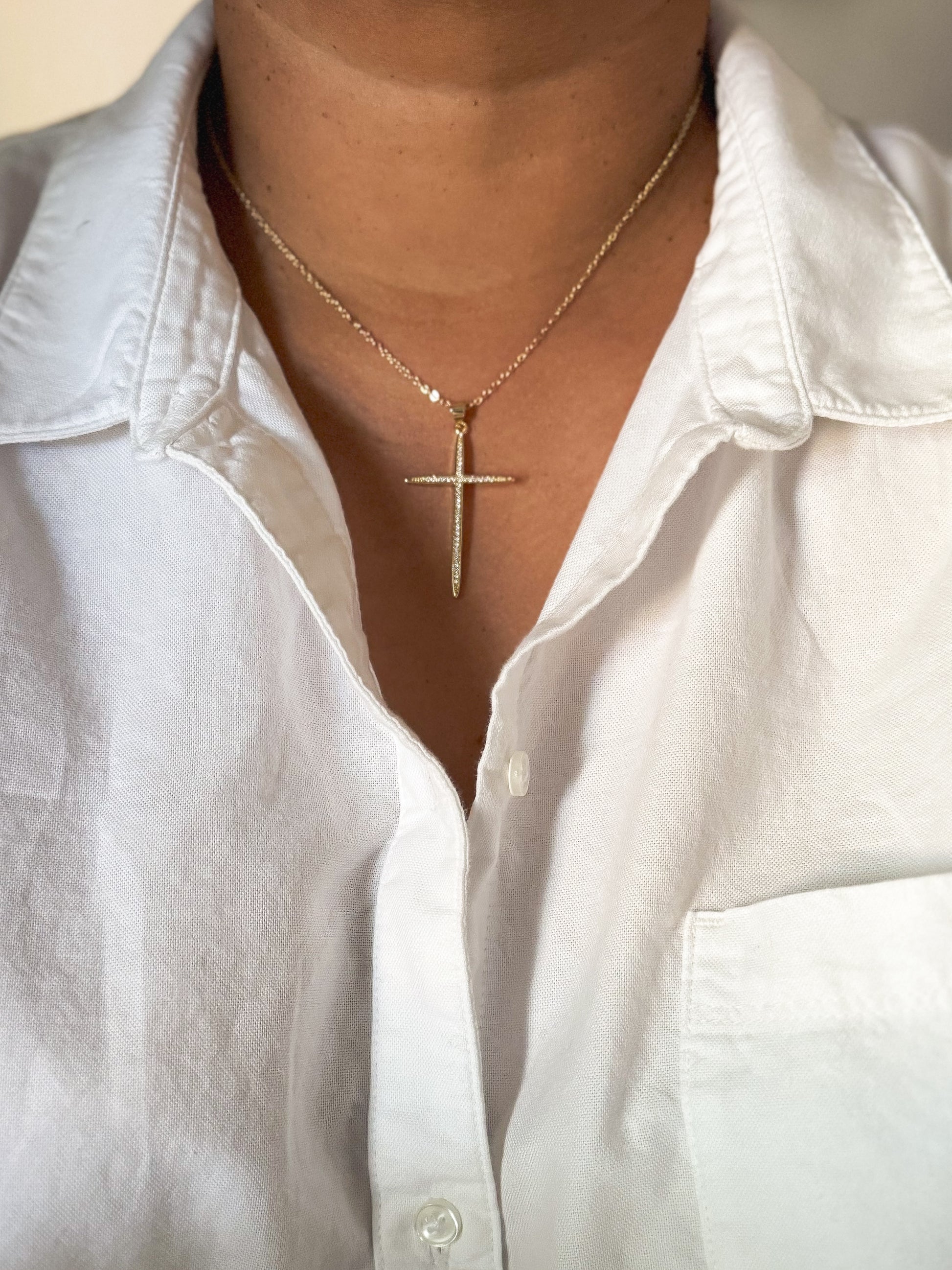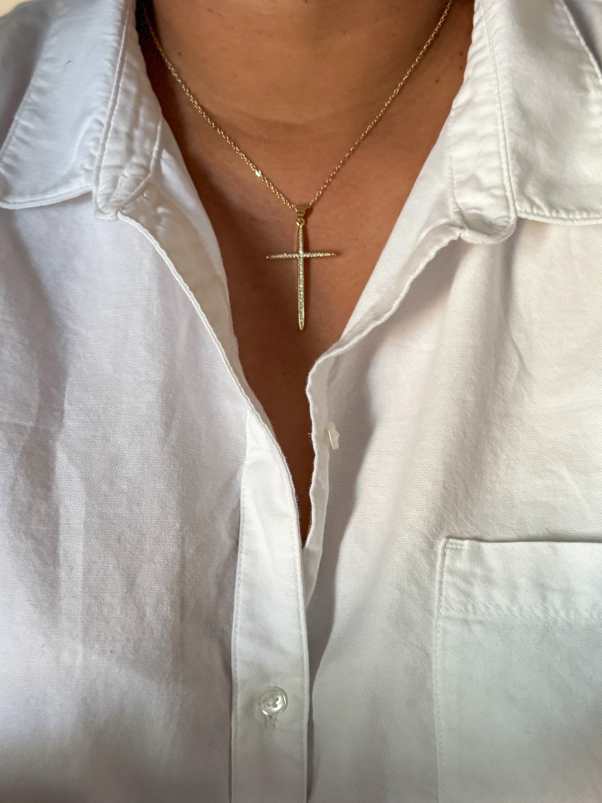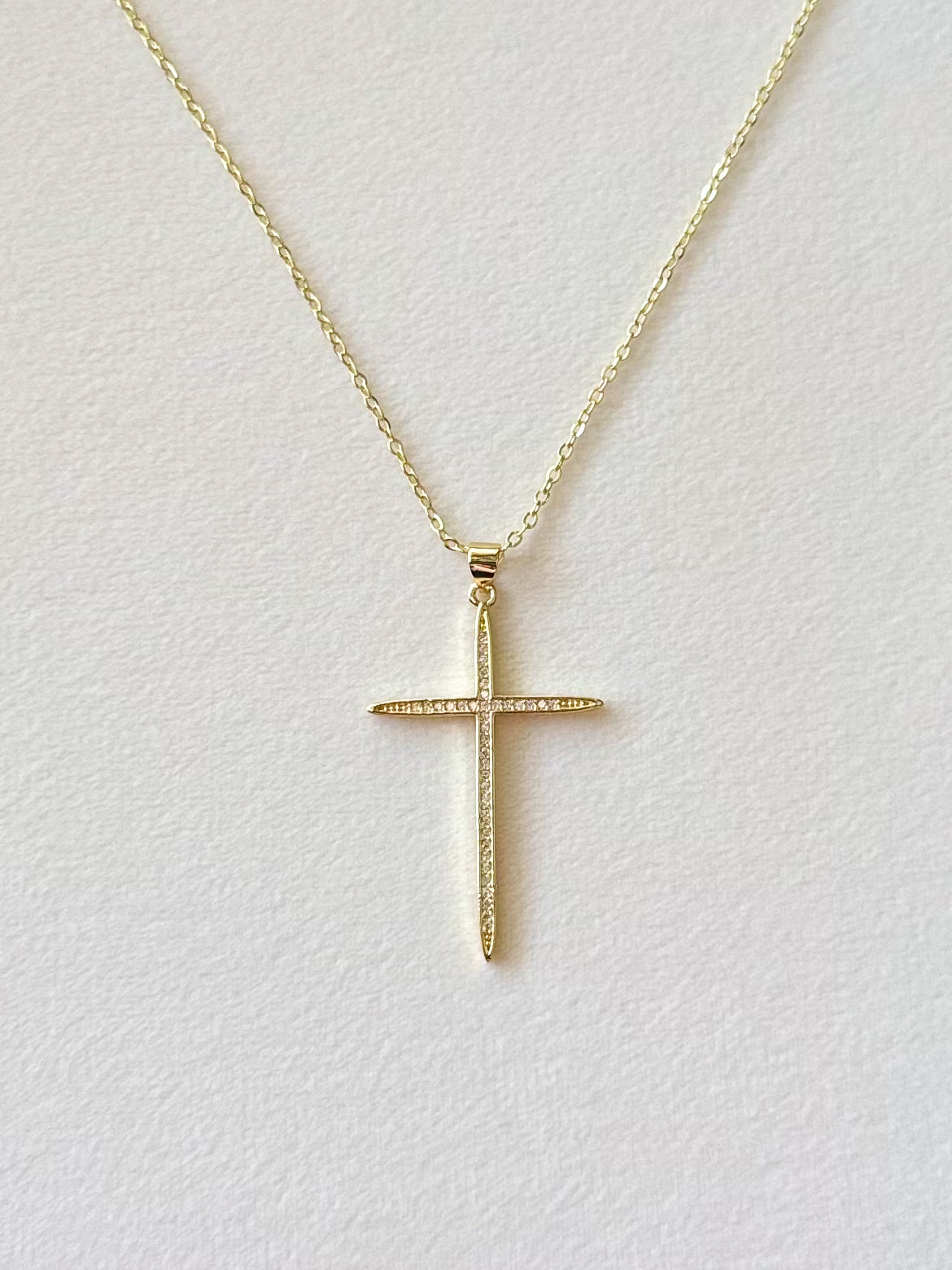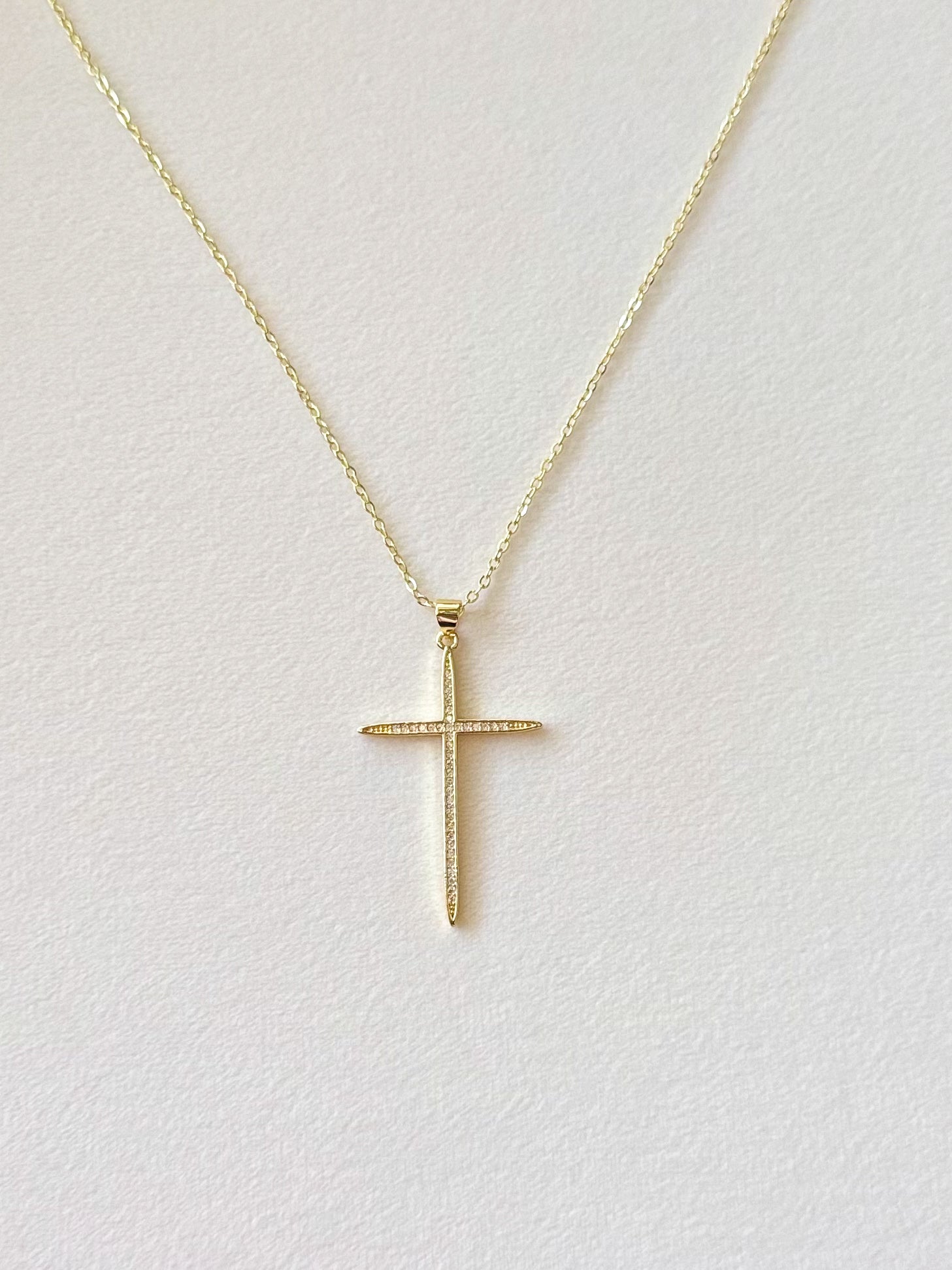 Indulge in luxury with our Elegant Cross Necklace. The dainty, large cross pendant exudes sophistication, while the slender pave design adds an exquisite touch.