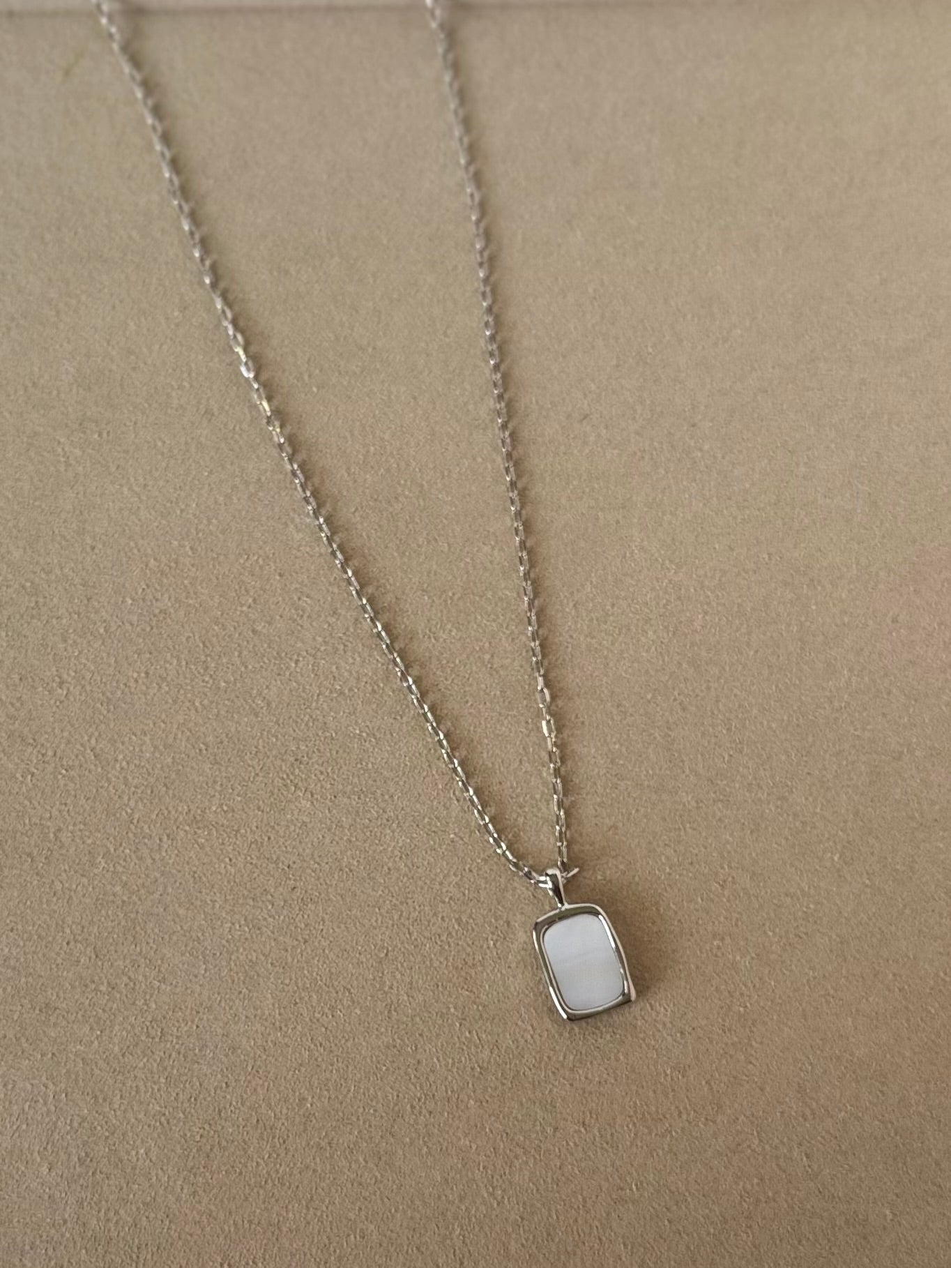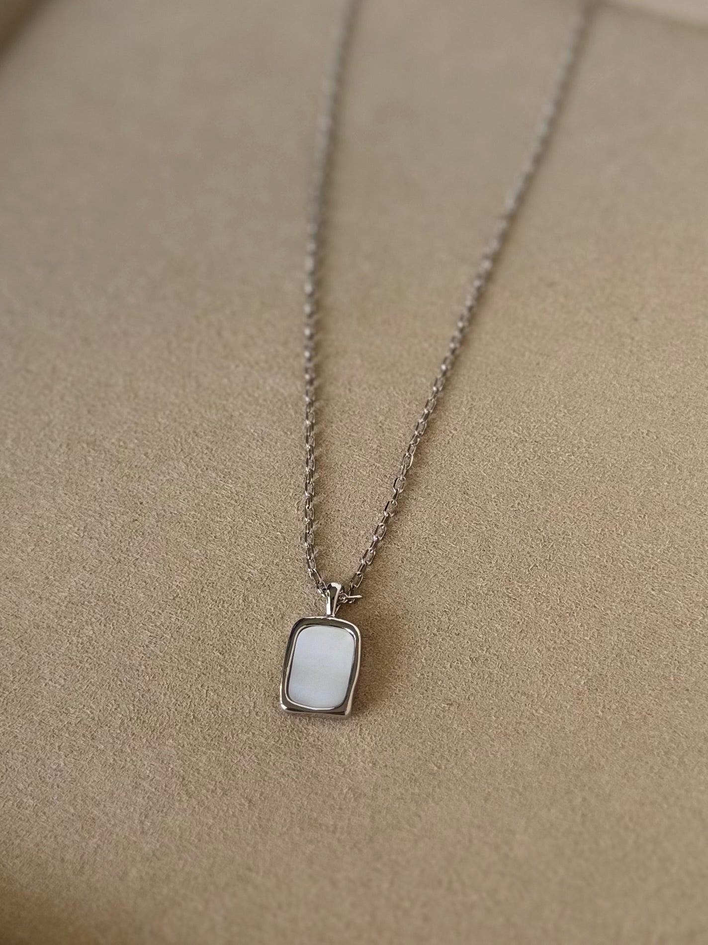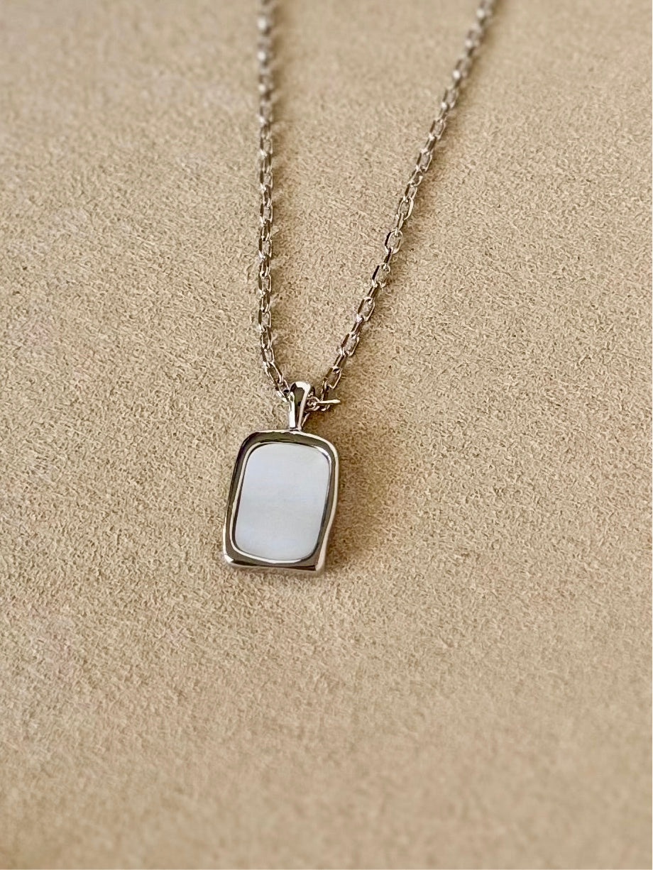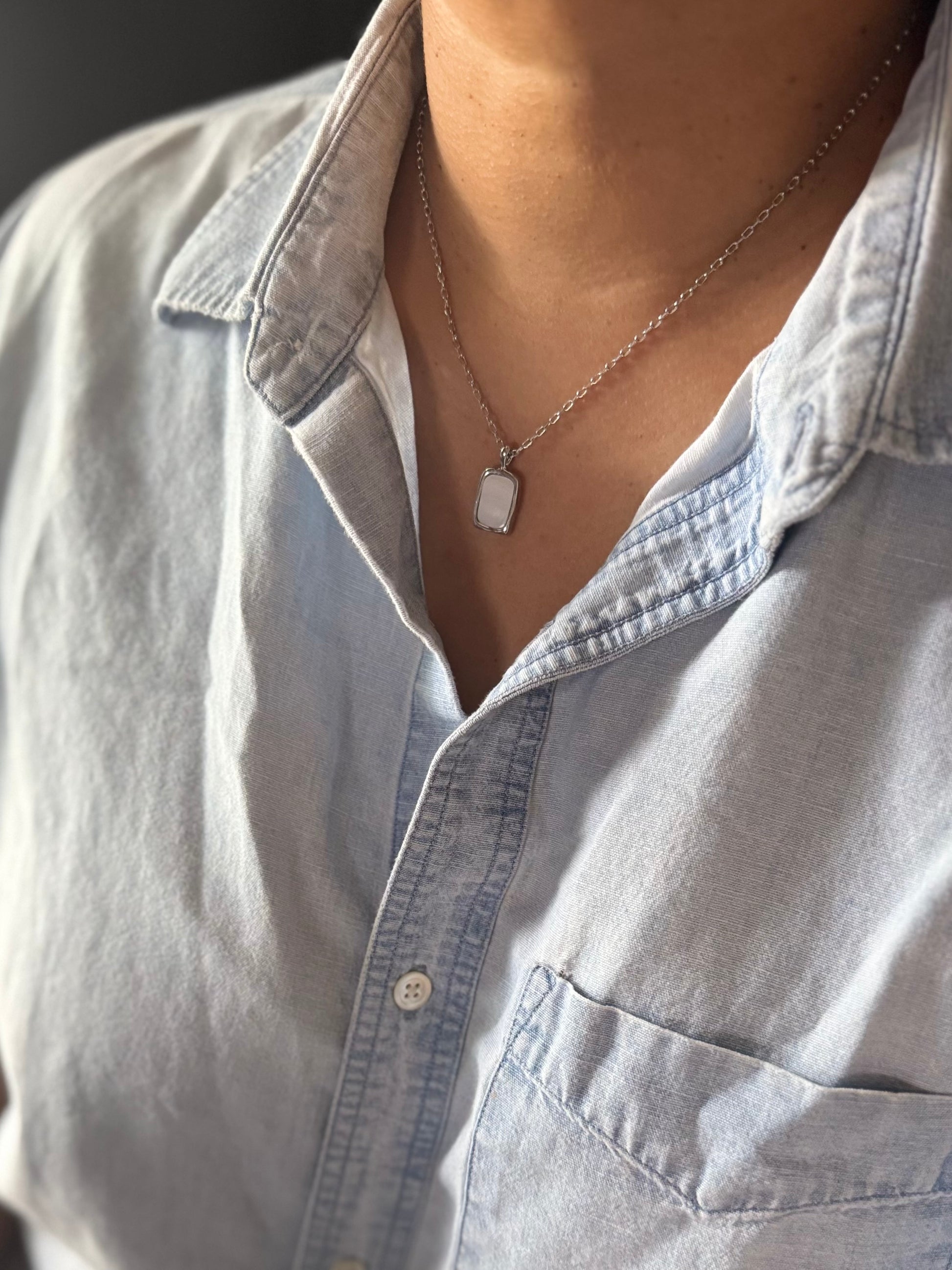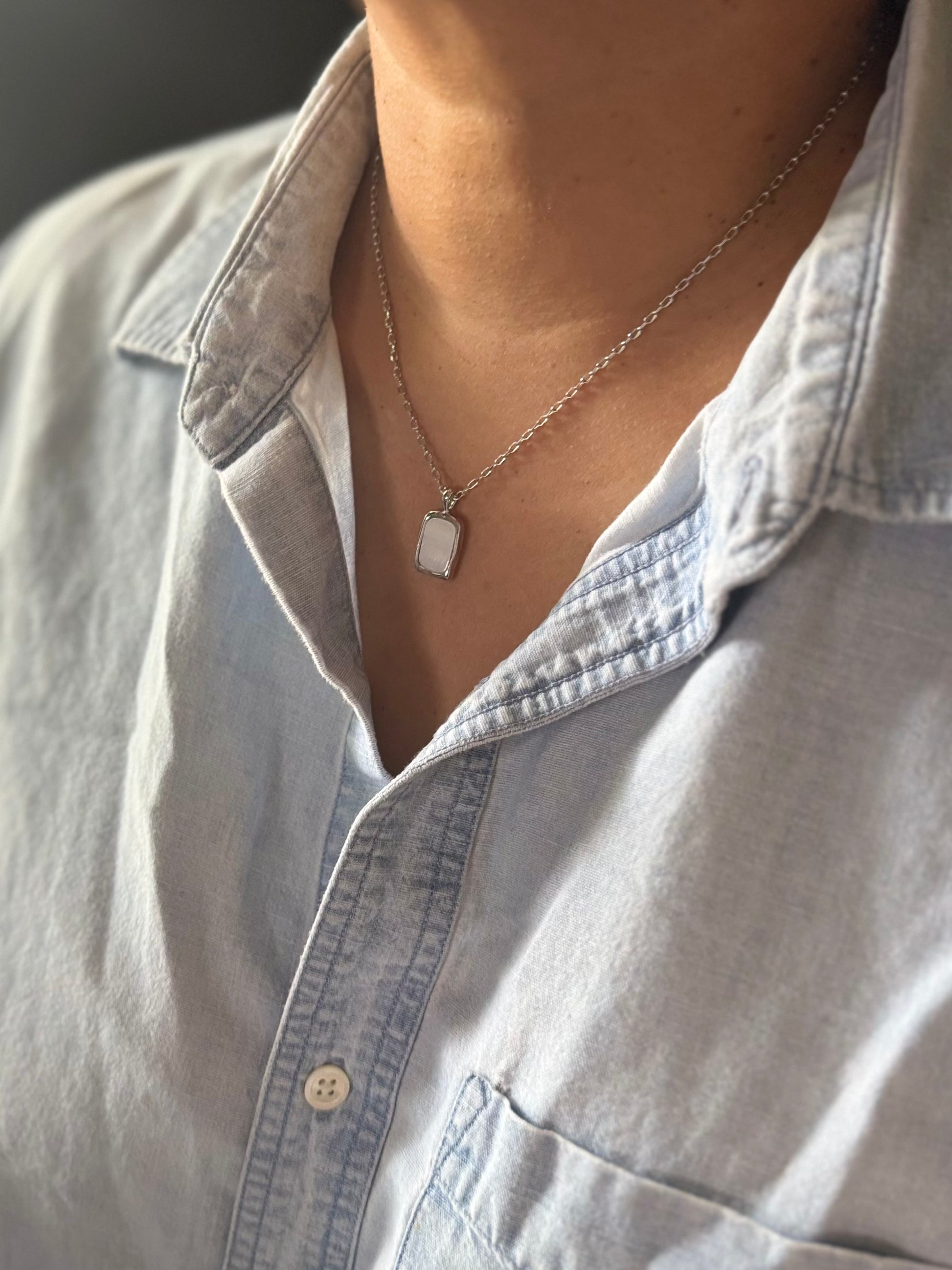 Add a touch of whimsy with our Framed Pearl necklace featuring a delicate Mother of Pearl inlay charm. Wear it alone for a simple, elegant look or layer it with other pieces for a fun and unique style.