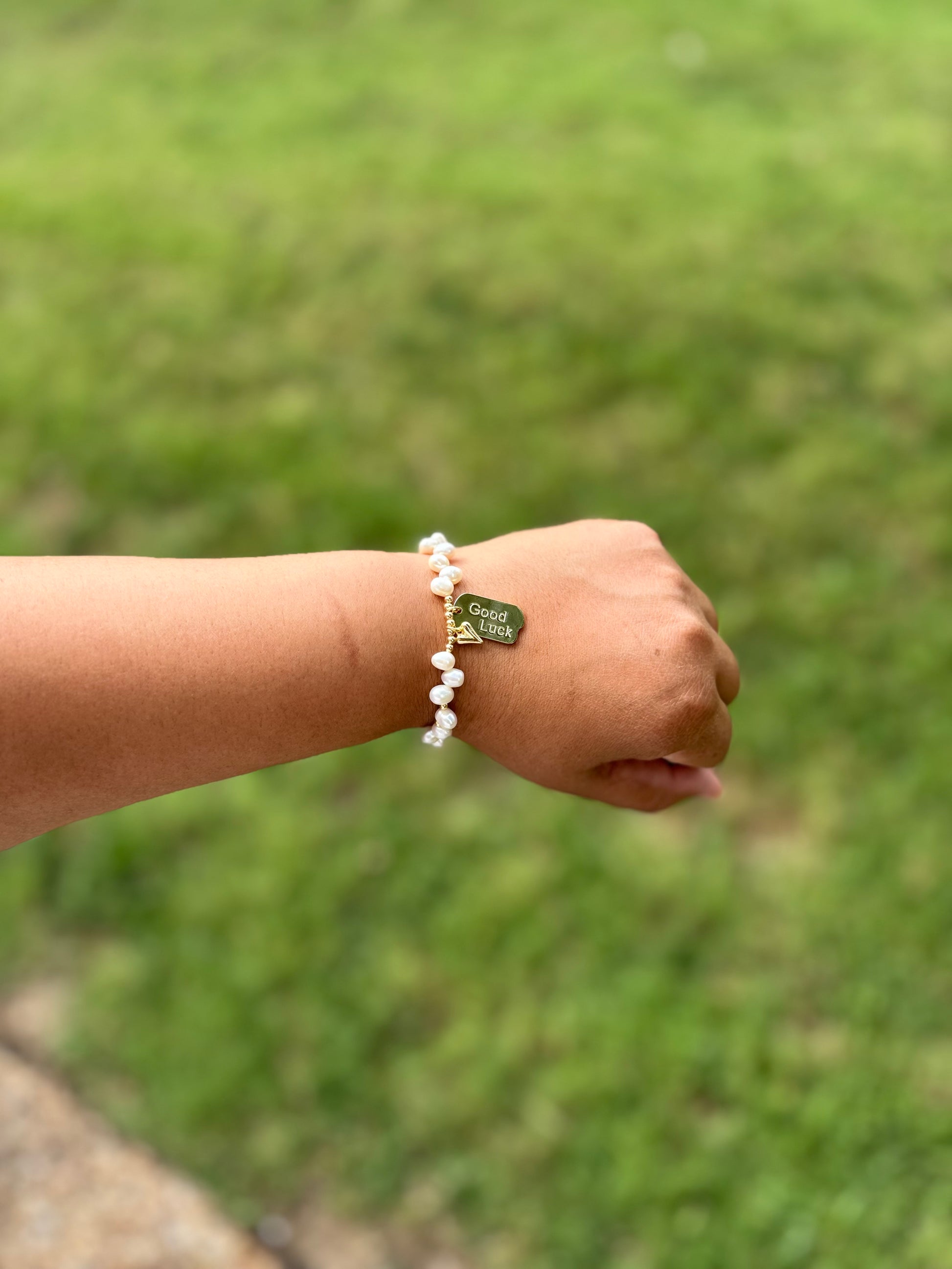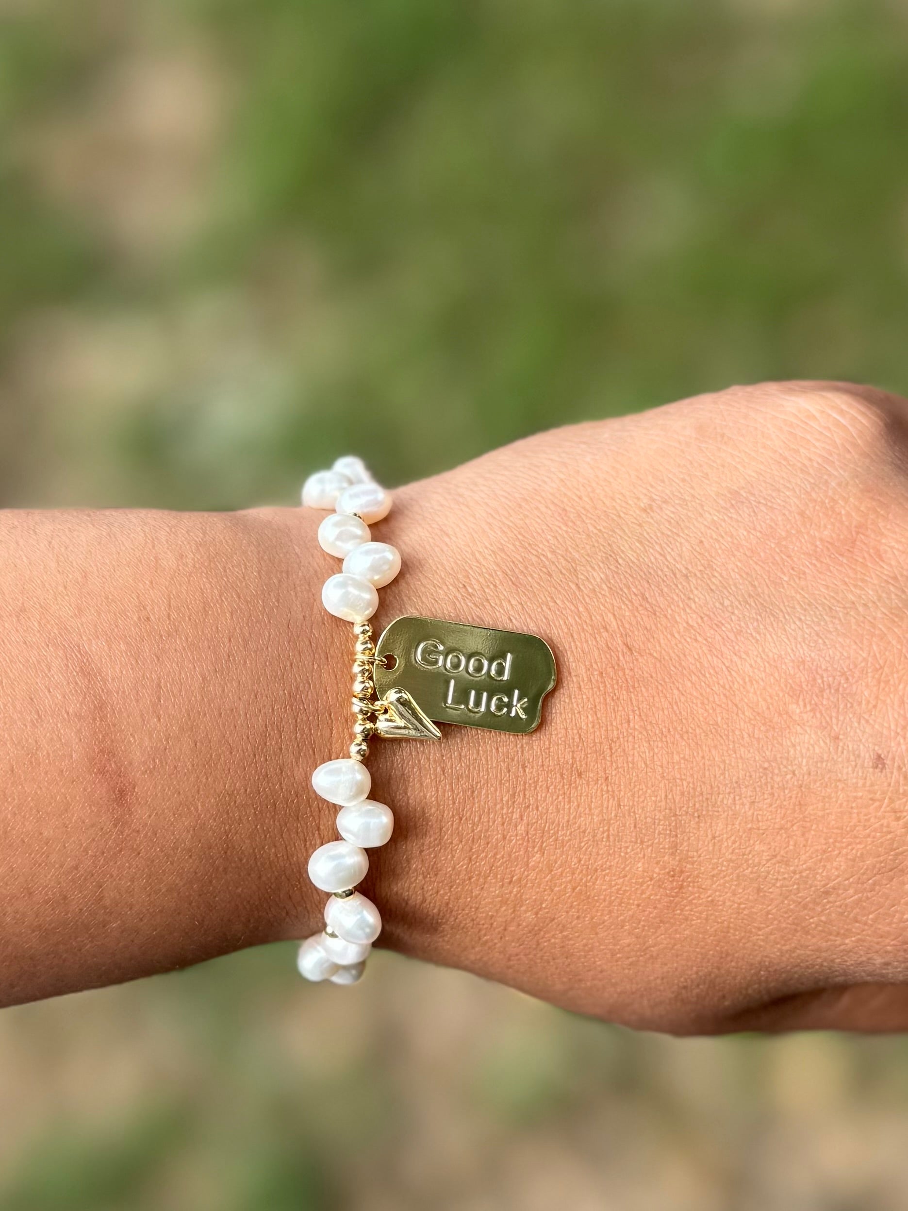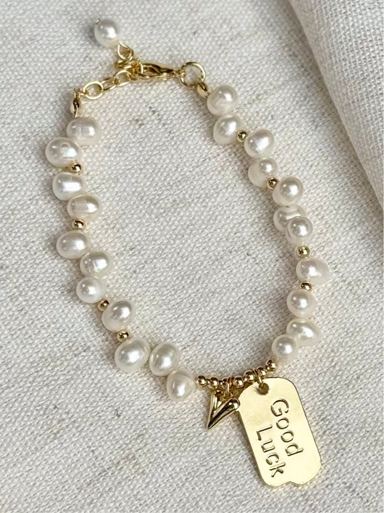 Wear your luck with this playful bracelet adorned with fresh water pearls and touches of gold. The staggered design adds a unique touch while the good luck and heart charms bring good vibes. Delicately crafted, this bracelet is perfect for adding a touch of something special to any outfit.
