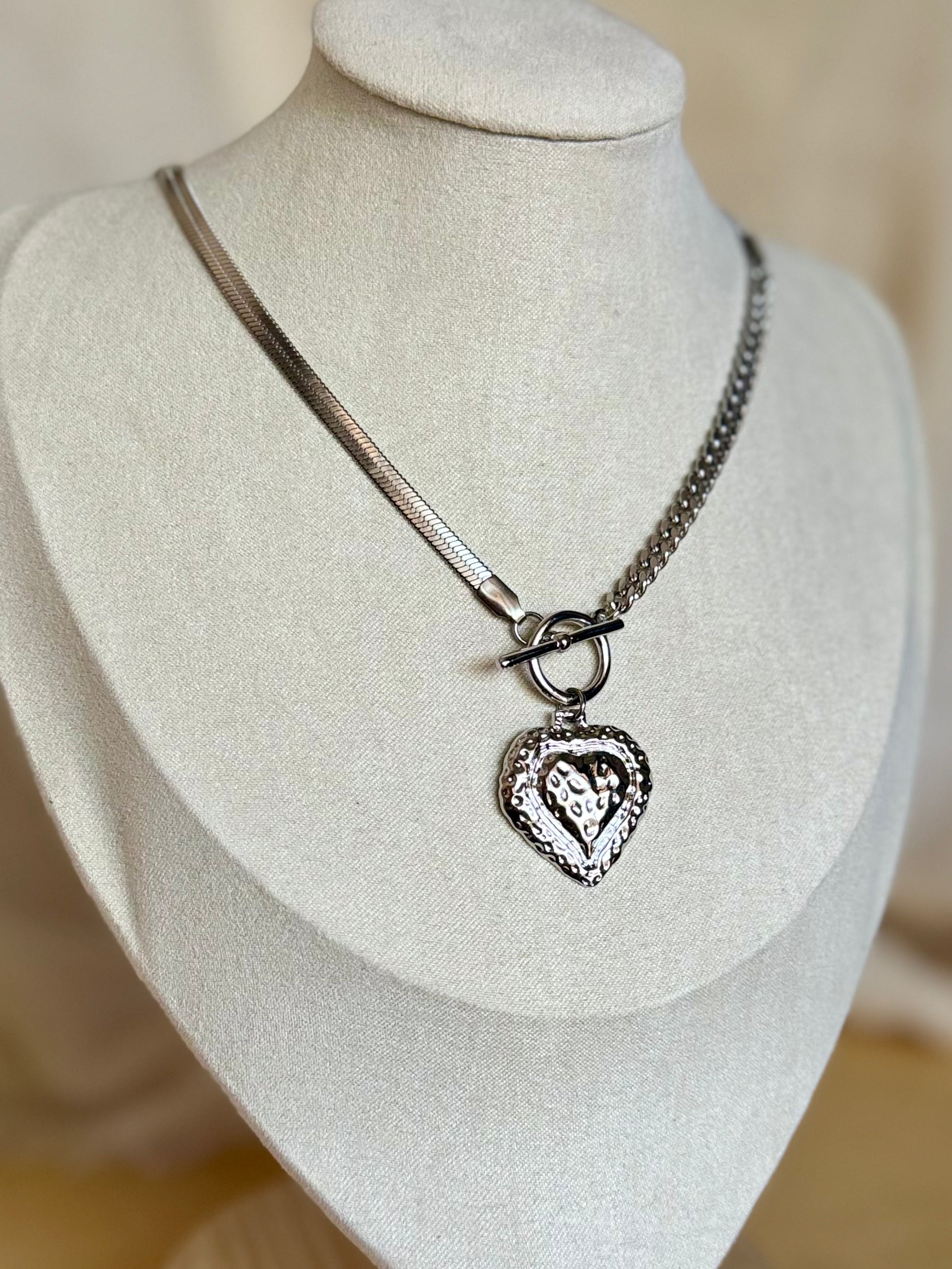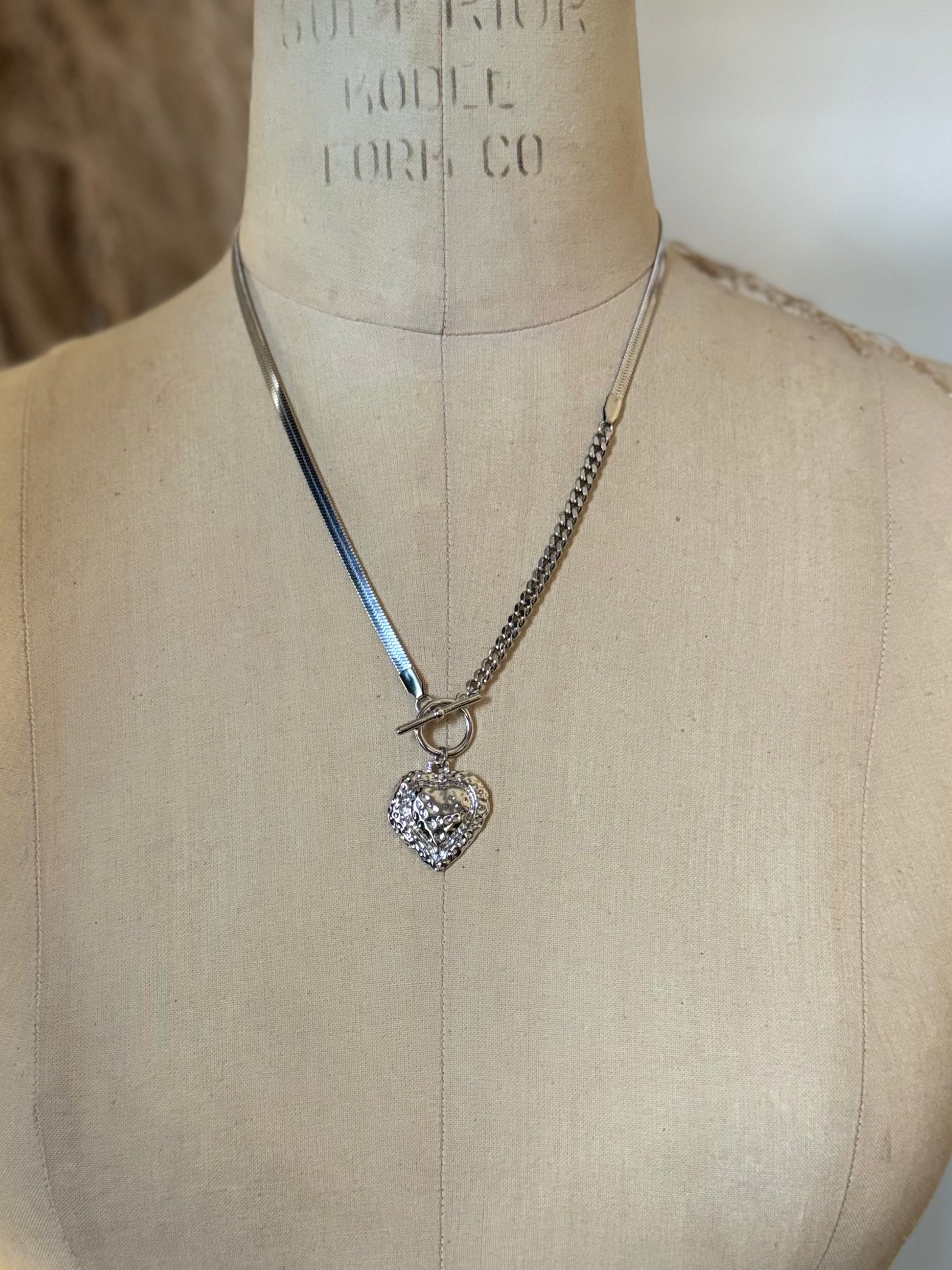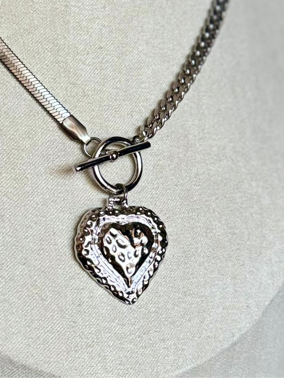 This silver mixed herringbone necklace features a unique hammered heart pendant, blending southwest style with a modern twist. Expertly crafted and artfully designed, this piece adds a touch of sophistication to any look.