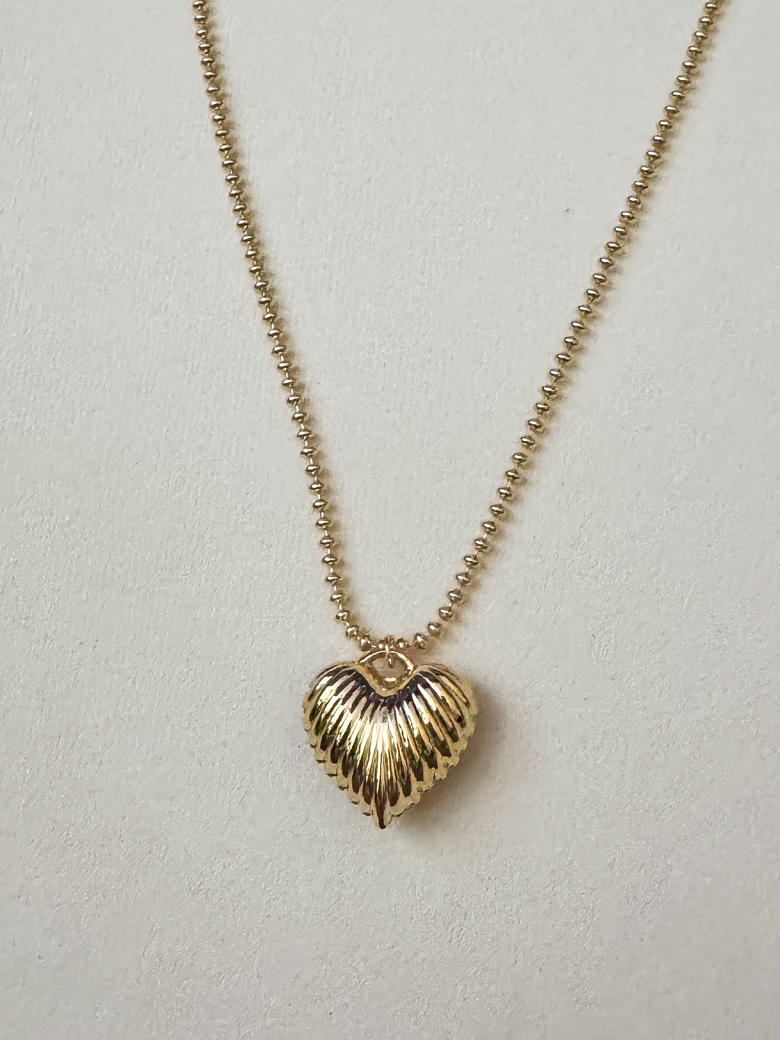 A sculpted gold heart that catches the light with every move. The ribbed texture adds dimension and edge, making this pendant both bold and effortlessly feminine. Paired with a sleek gold ball chain — a striking blend of softness and strength, perfect for everyday shine.