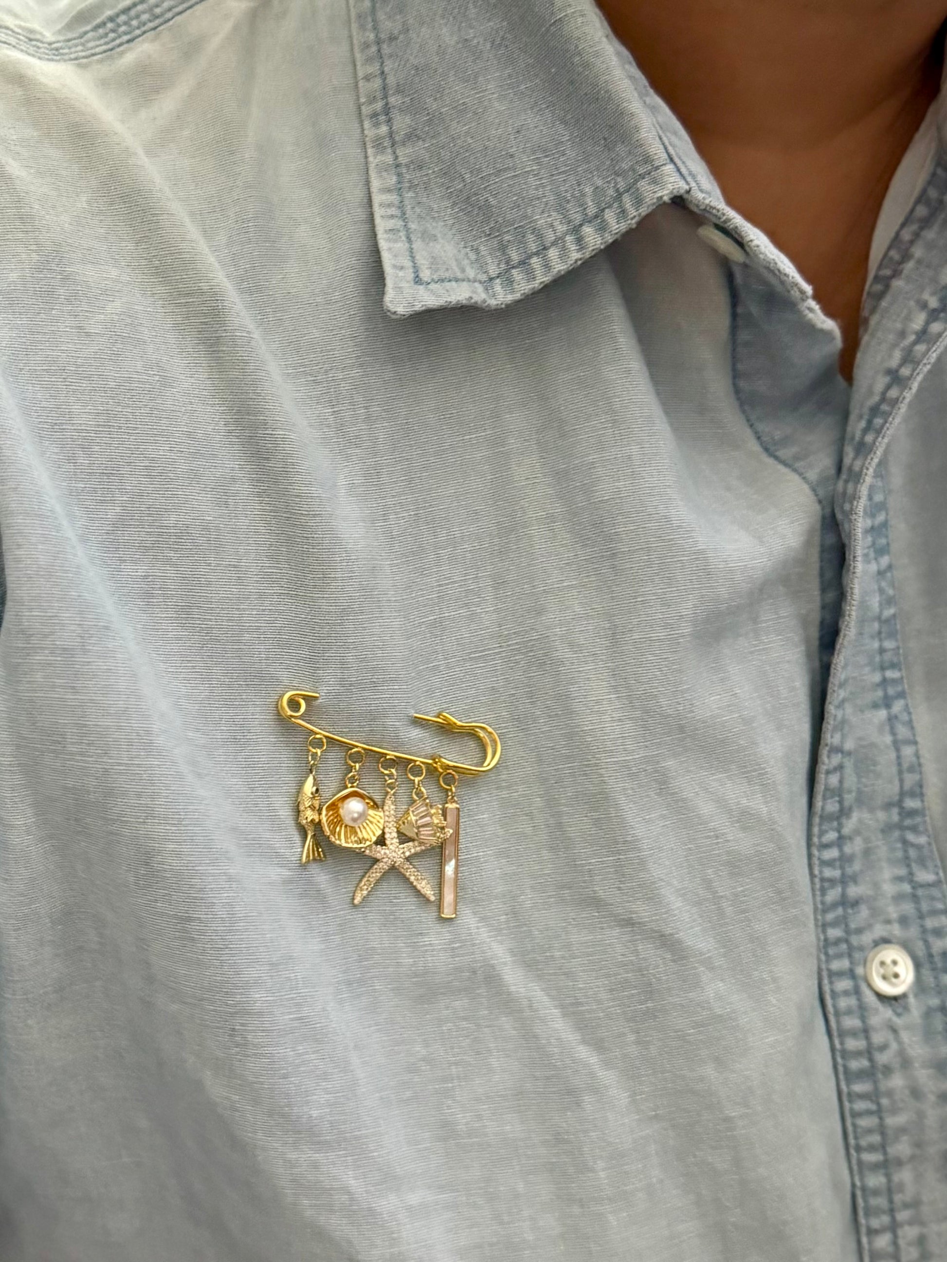 A playful mix of charms — pearl seashell, sparkling starfish, and golden fish — create a whimsical, beach-inspired piece reminiscent of hidden treasures.