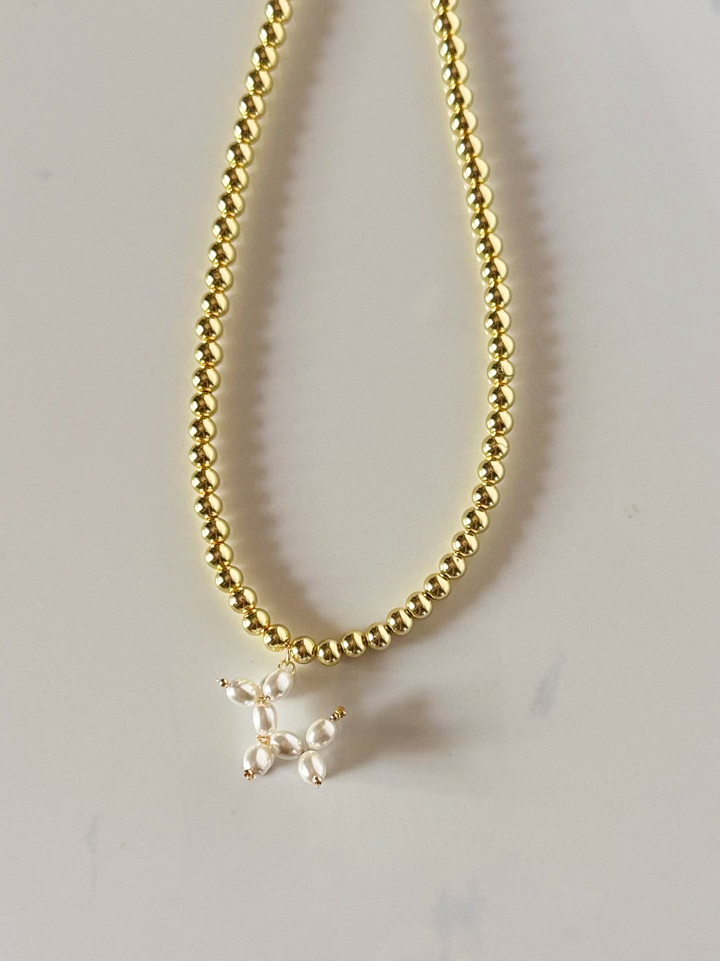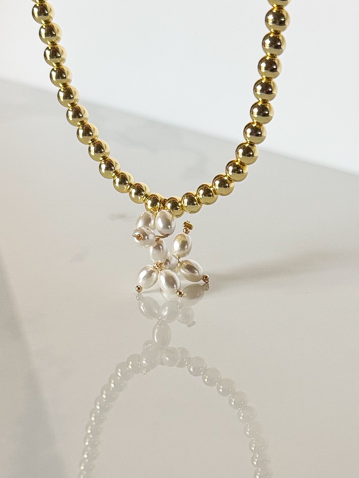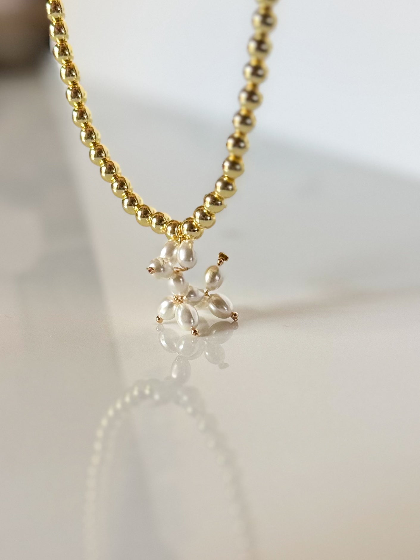 Introducing our stunning Pearl Balloon Dog! This magnificent handcrafted piece is made from genuine mother of pearl beads, adorned with a bold gold beaded necklace. A true statement piece that exudes confidence and will always stand out in a crowd. Perfect for those who appreciate unique and eye-catching jewelry.