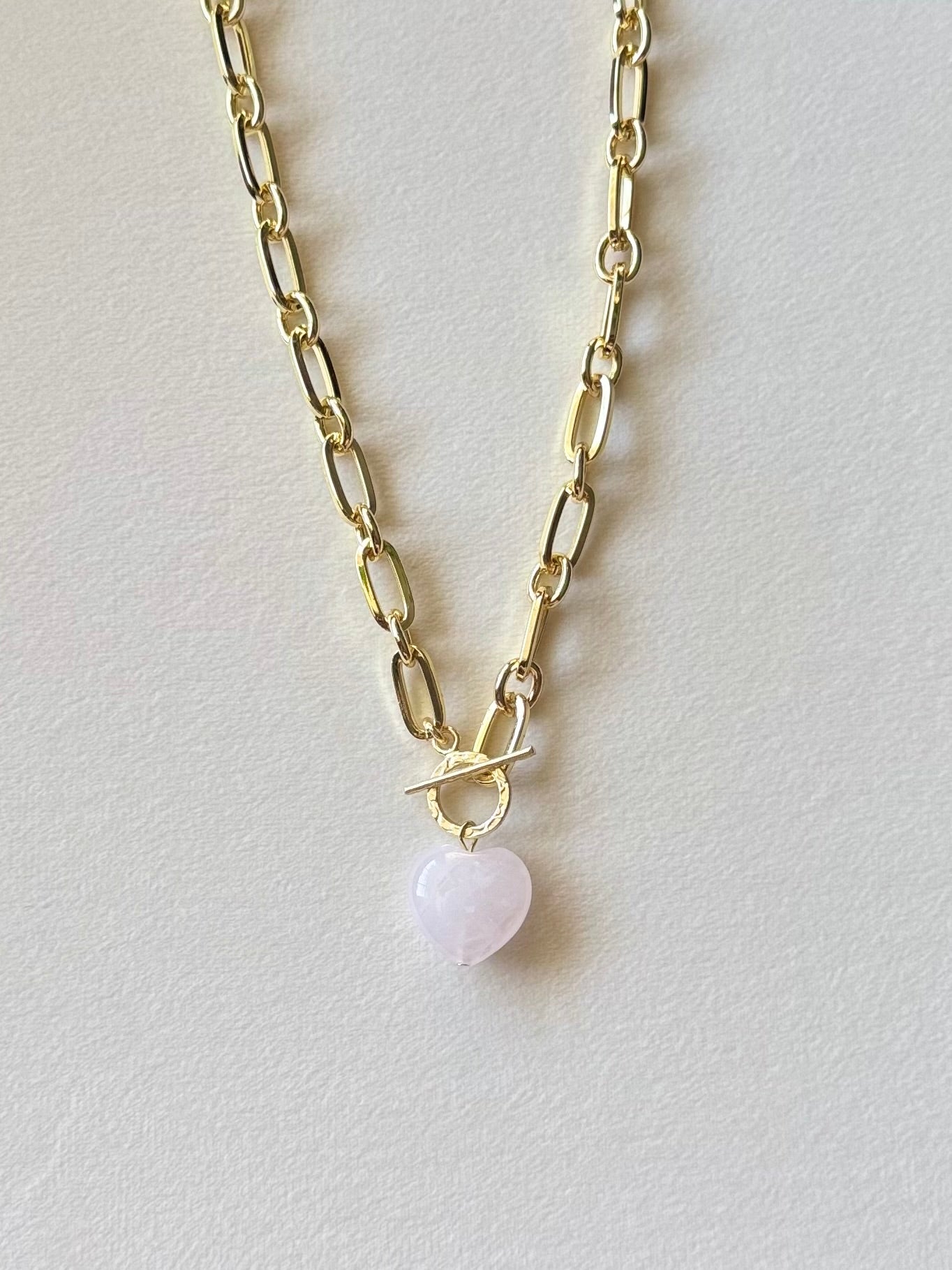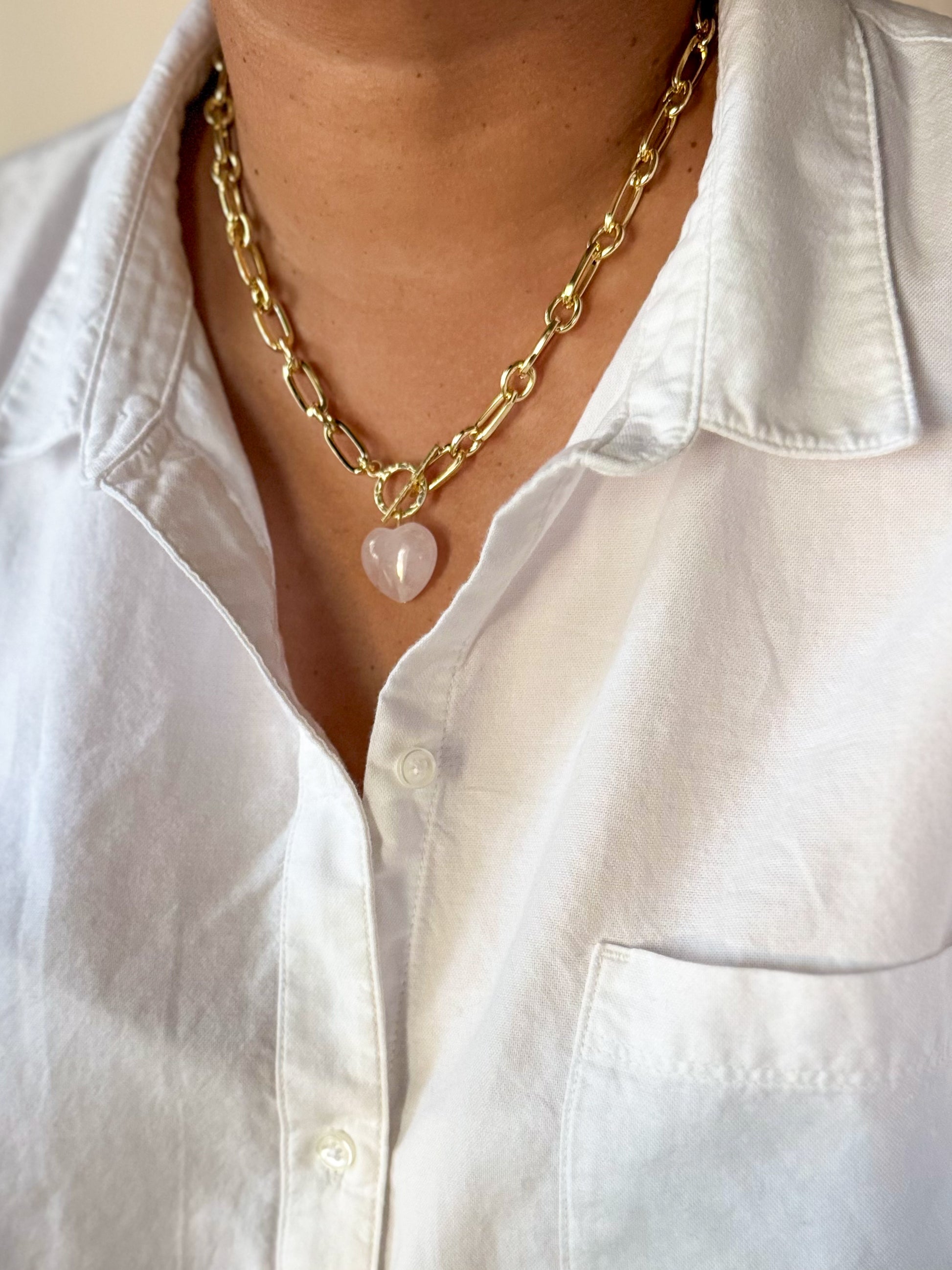 Indulge in this exquisite Pink Quartz Crystal Heart Necklace. The chunky yet effortless design adds a touch of elegance to any outfit. The smooth rose quartz heart pendant exudes love and compassion, making it the perfect statement piece for any sophisticated look.