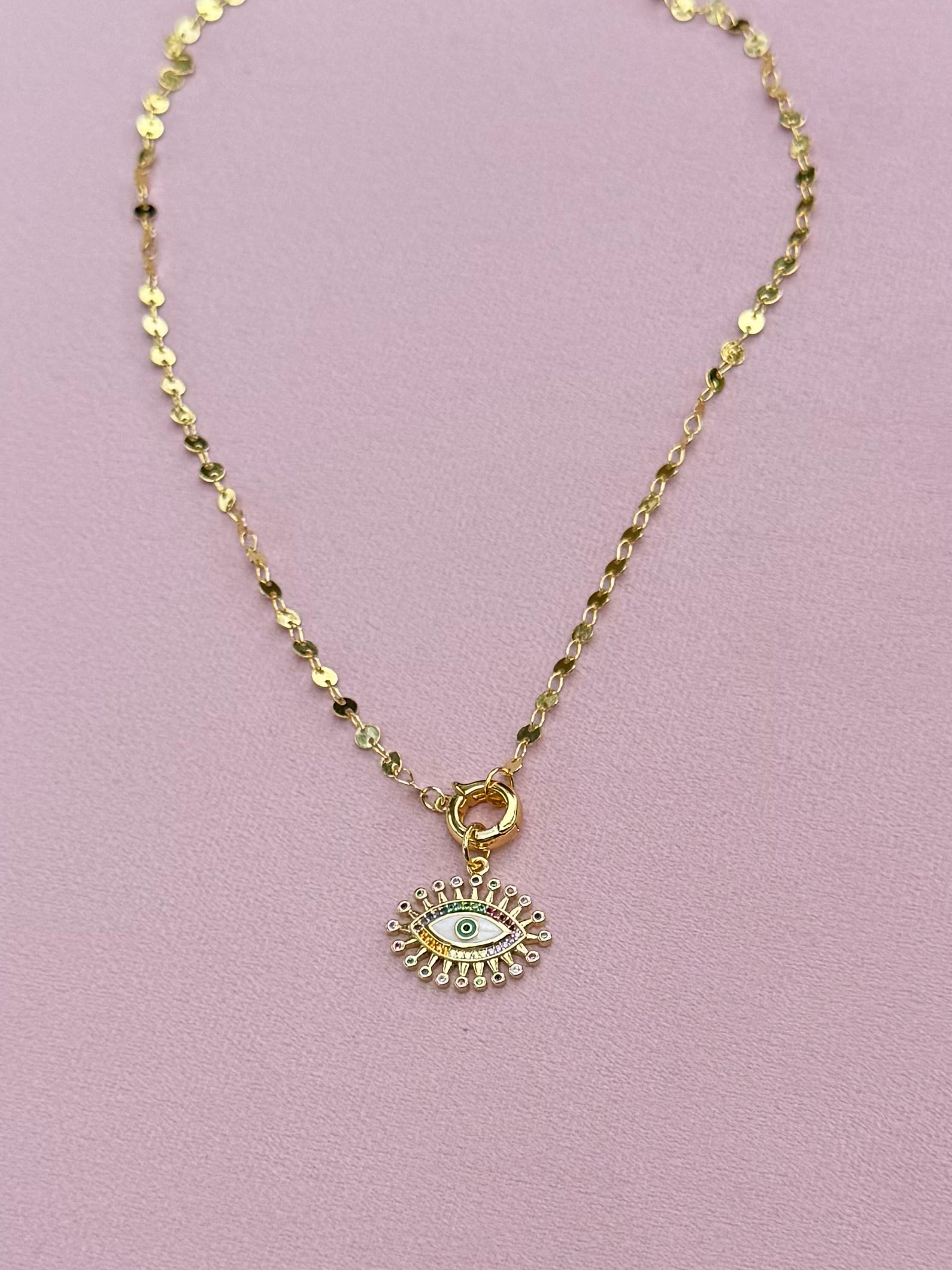 A symbol of protection with a modern twist — this necklace features a radiant evil eye charm surrounded by sparkling accents and rainbow-hued details. Set on a delicate gold chain, the pendant catches the light beautifully, making it both a meaningful talisman and a stylish statement piece. Wear it solo for everyday protection or layer it with other favorites for a boho-chic vibe.