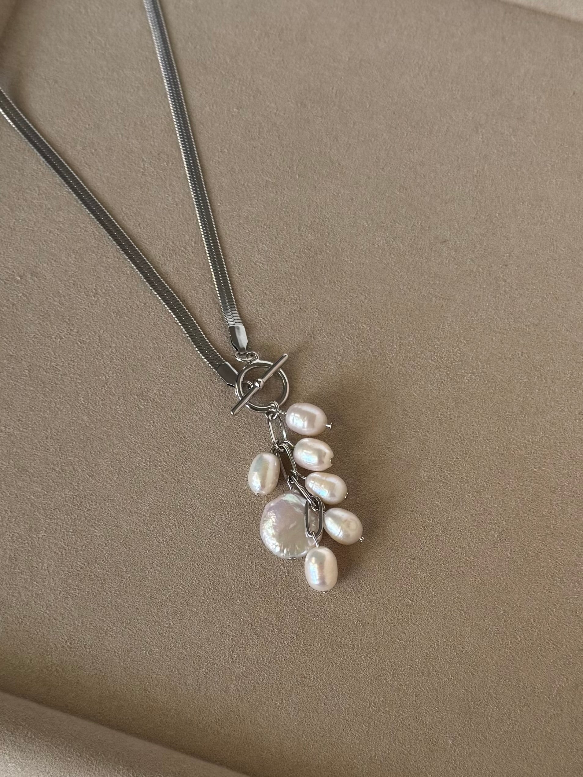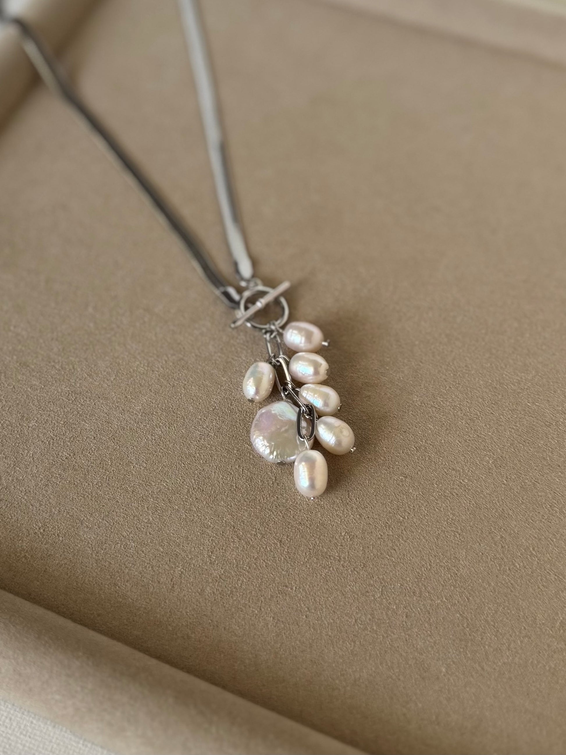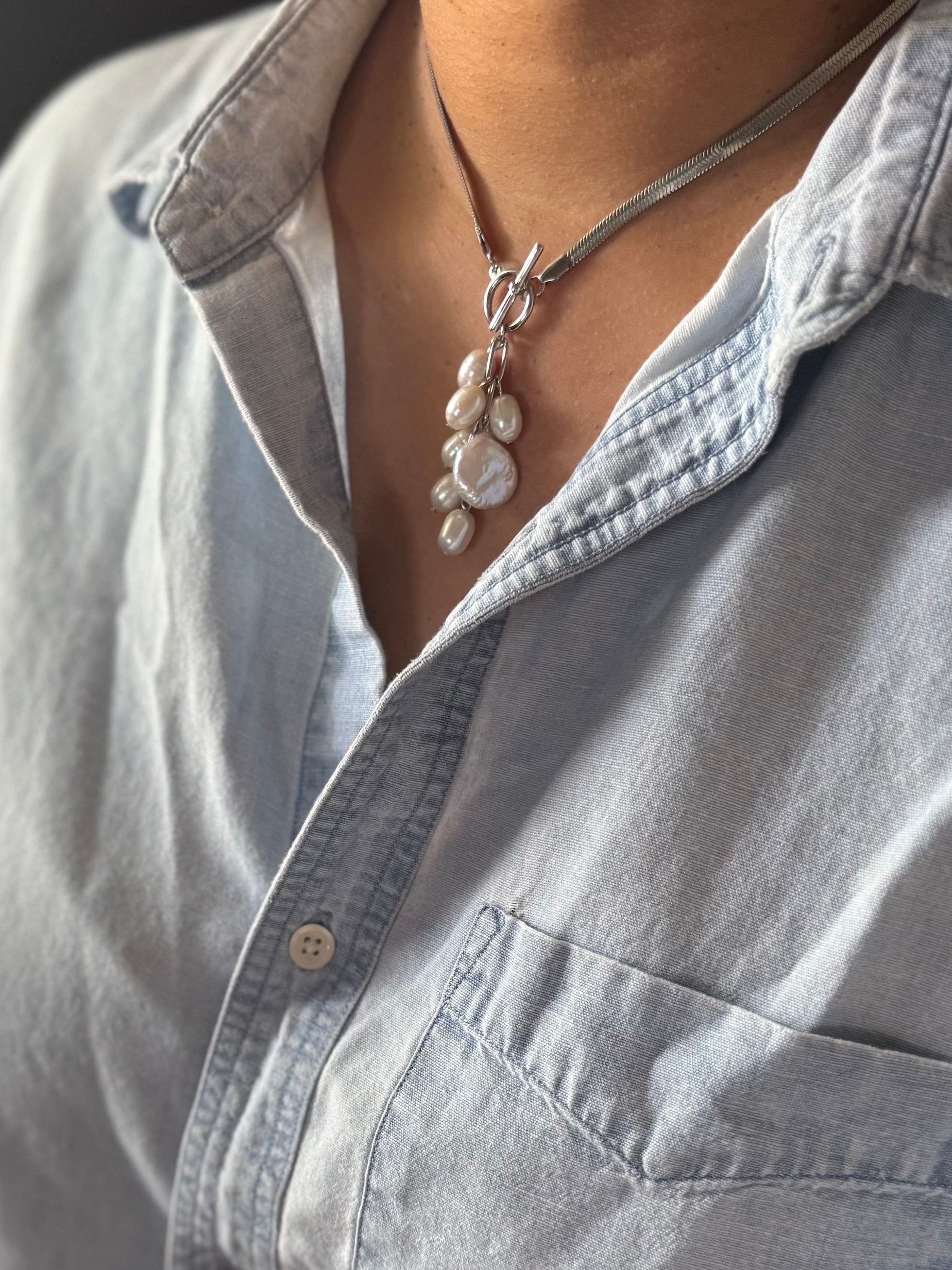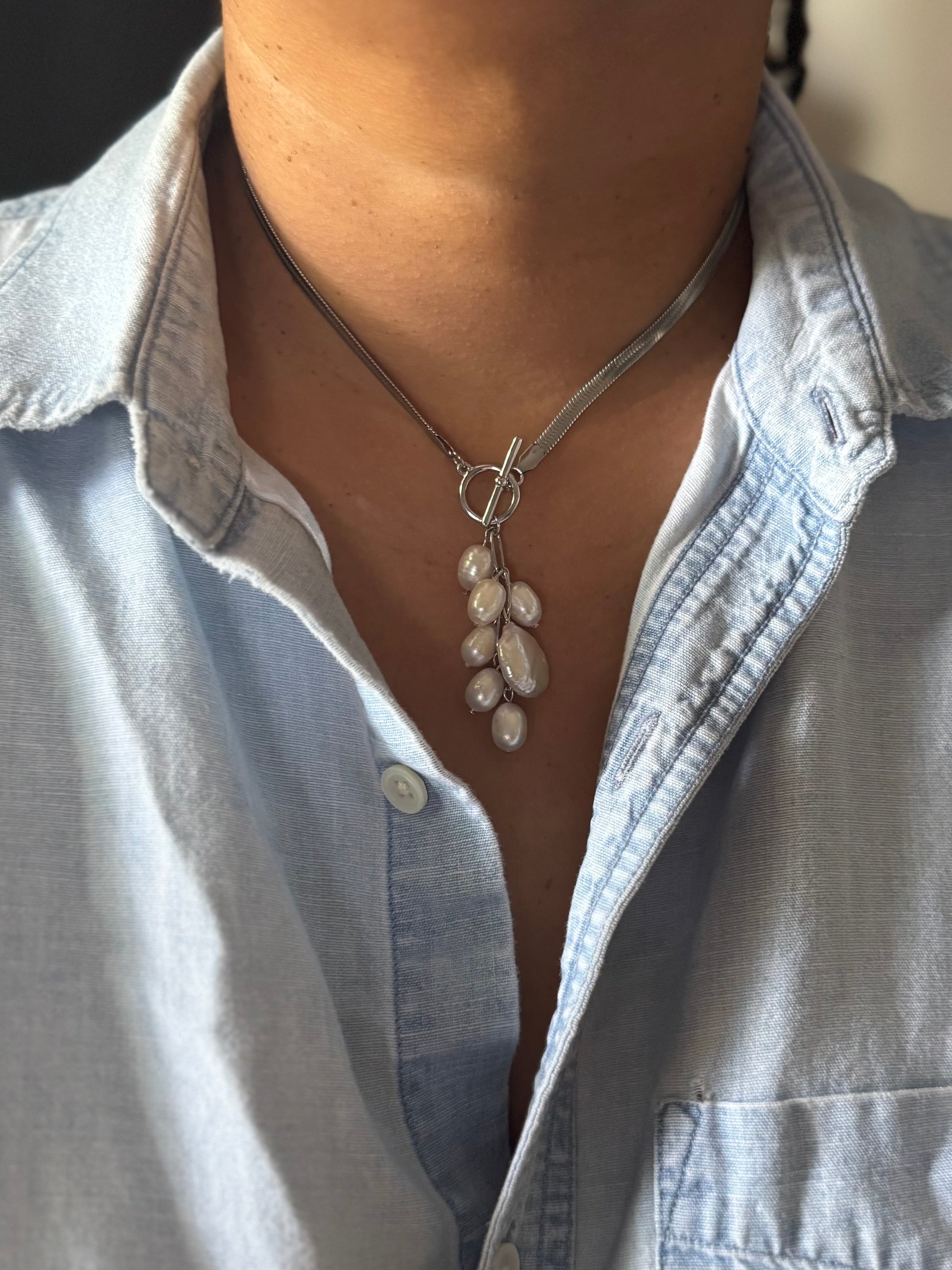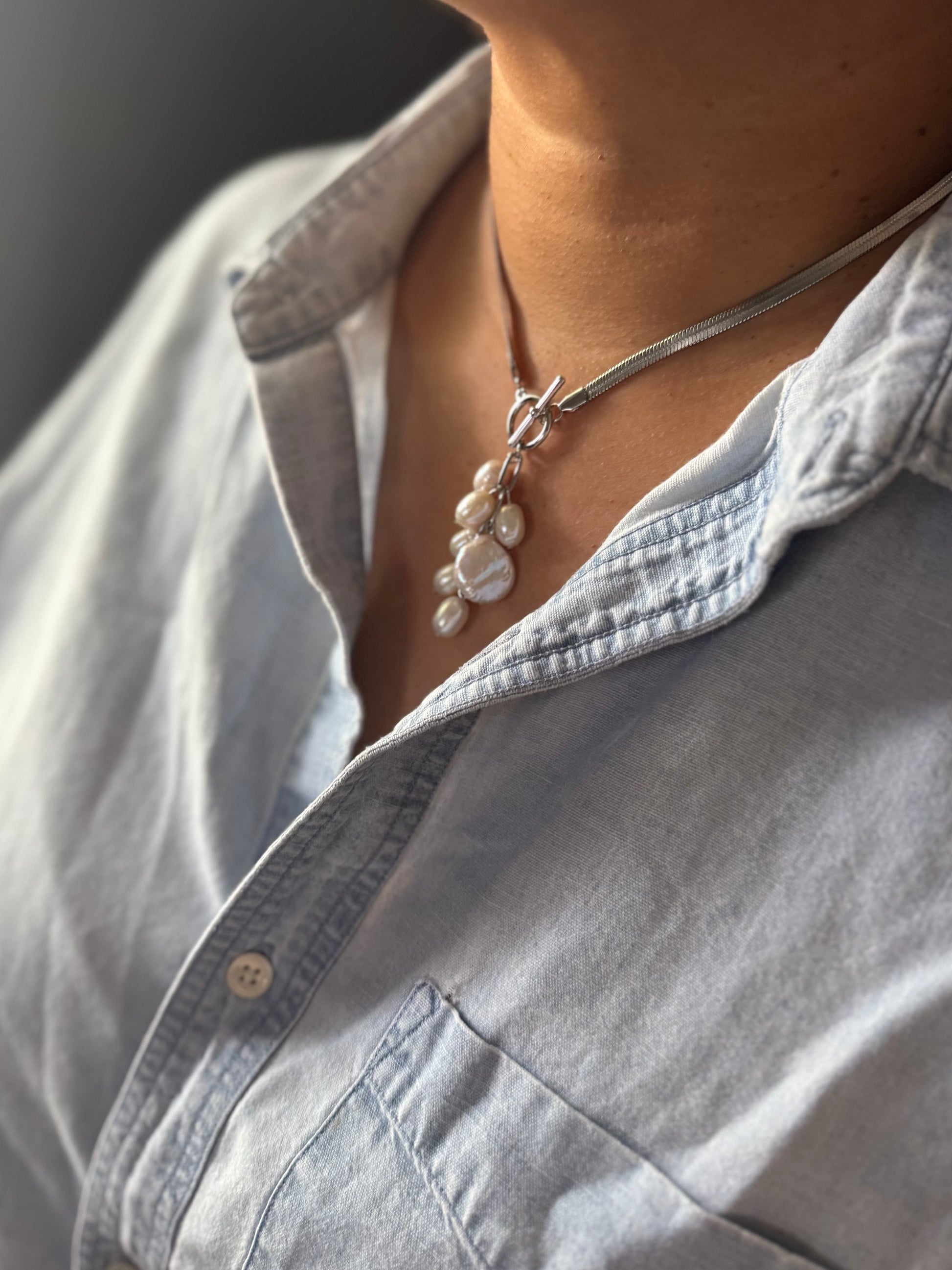 This unique reverse herringbone necklace is dripping with fresh water pearls and is sure to turn heads! With a secure necklace clasp in the front, this statement piece is perfect for making a bold and stylish statement.