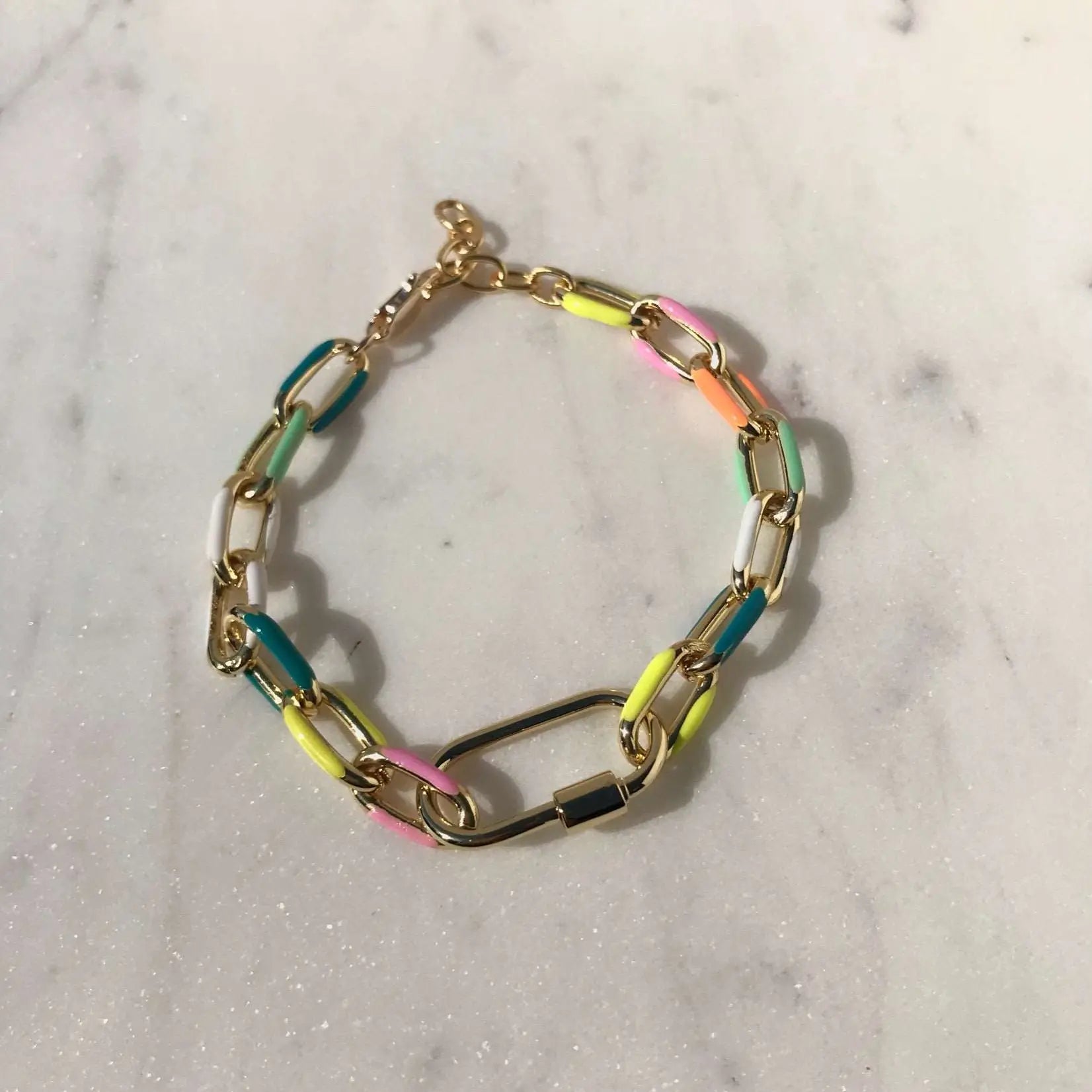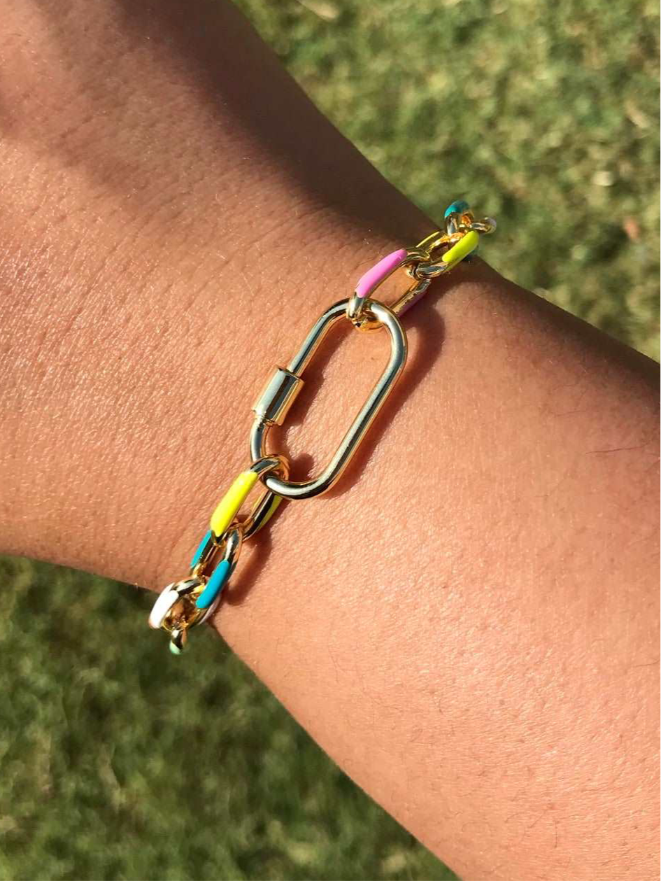This Summer Link Bracelet is perfect for the bright days ahead. It features gorgeous summer colors and is gold-plated for a more polished look. Wear it solo for a fun daytime look or combine it with the matching necklace or summer hoops for an extra special look.