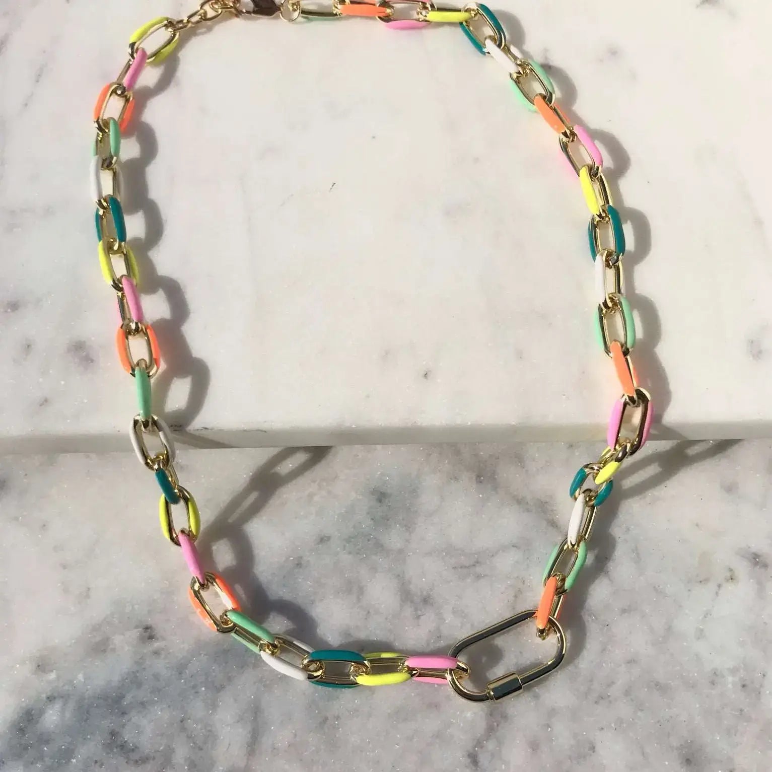 This Summer Link Necklace features fun enamel links in bright summer colors, all plated in gold for a warm, cheerful look. Wear it alone or layer it up for a more dynamic statement.
