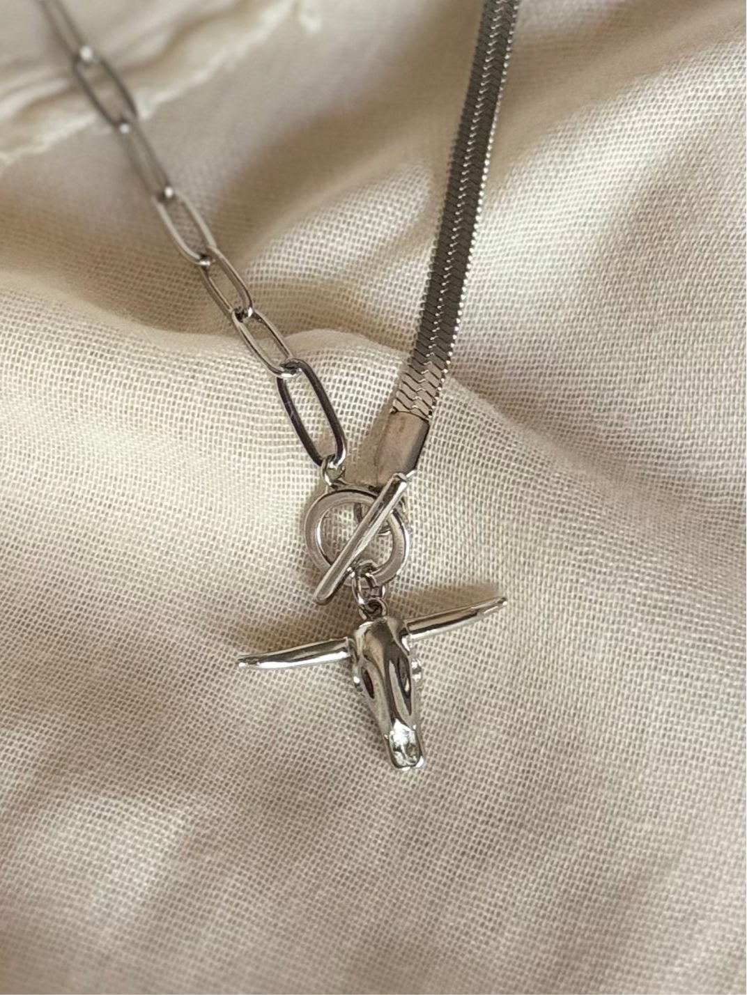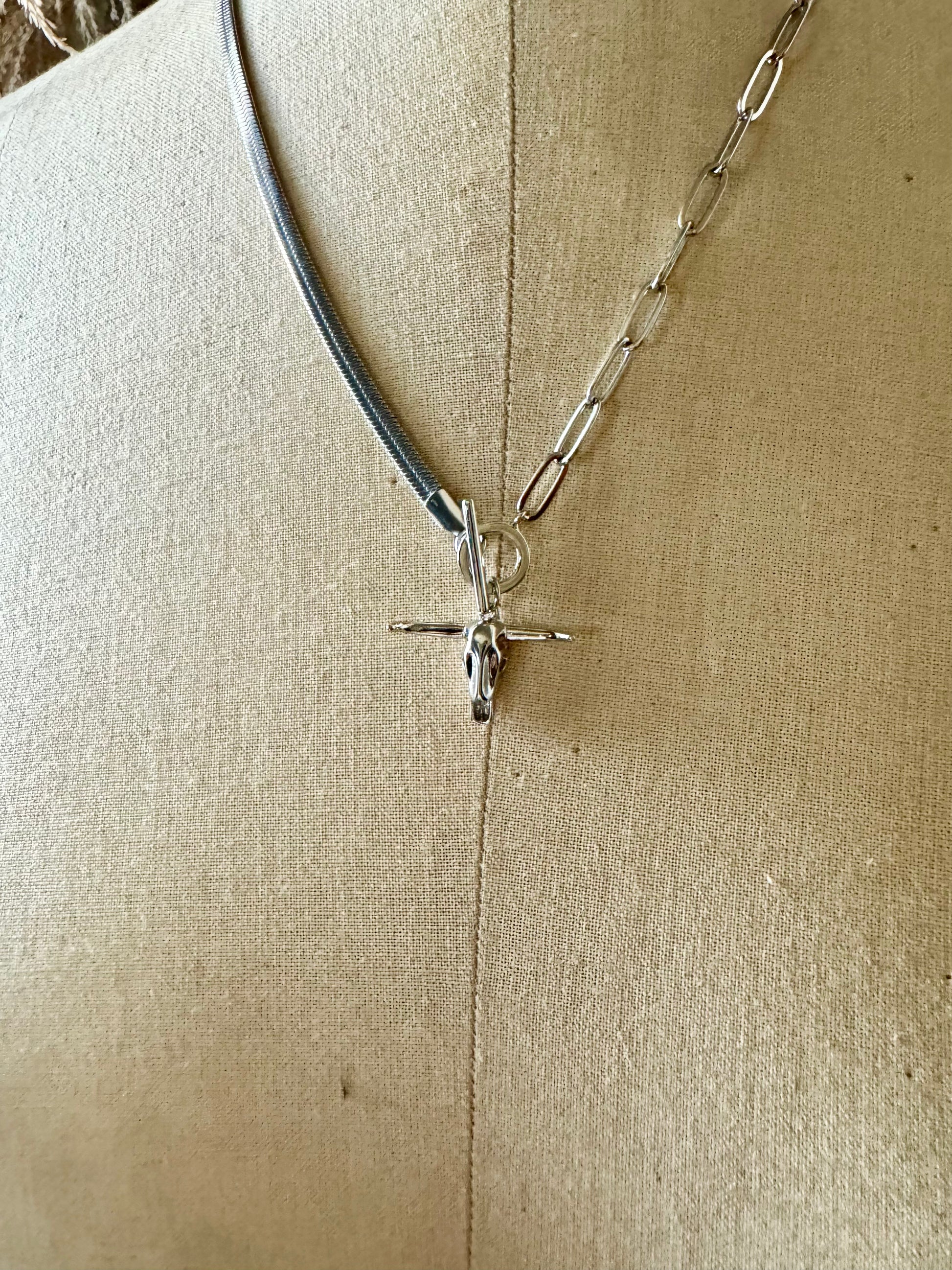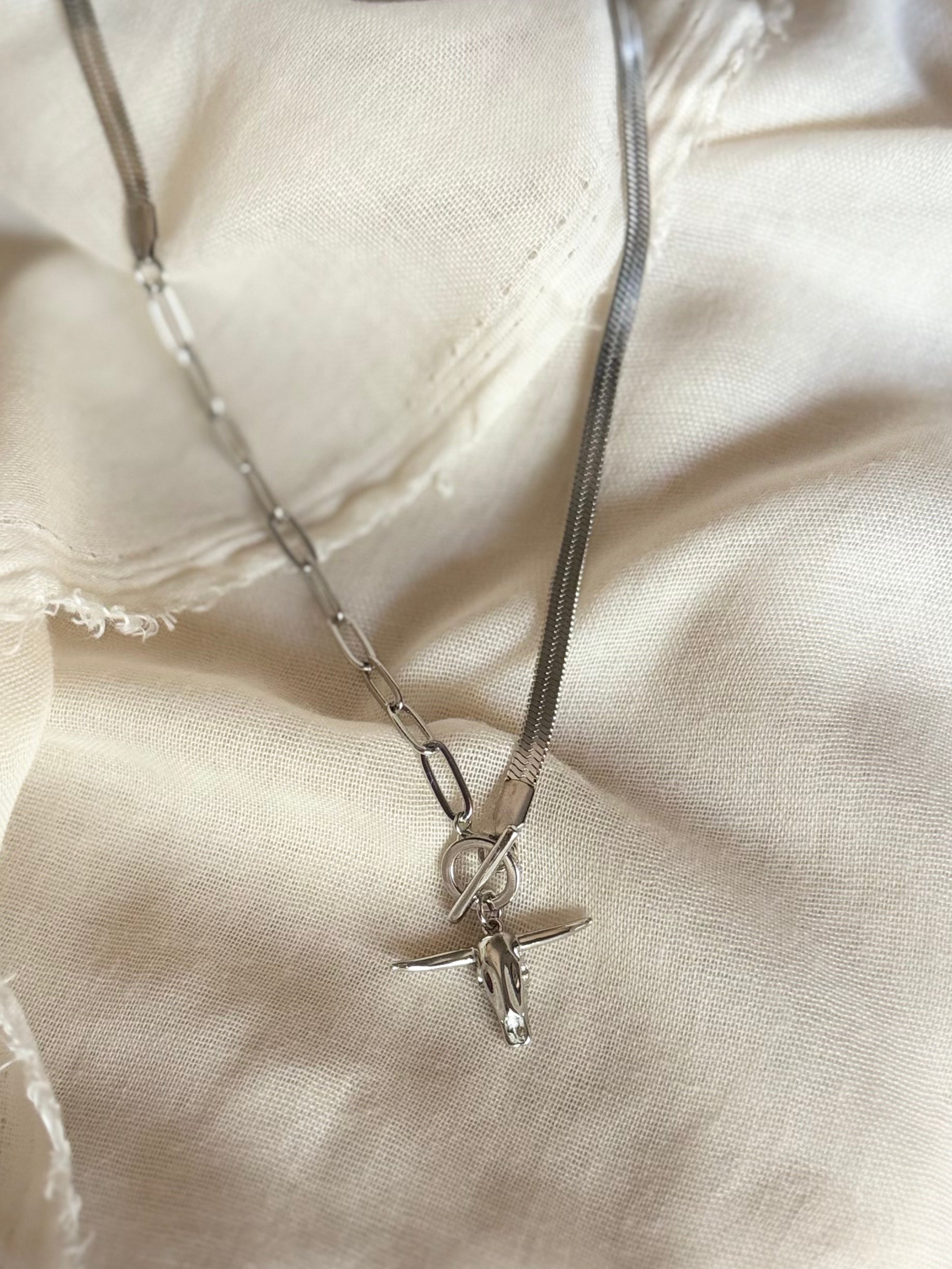 Featuring a long horn pendant, herringbone and link design, this necklace is perfect for any gal who wants to add a fun touch to their outfit. Whether you're from Texas or not, this necklace is guaranteed to make a statement!