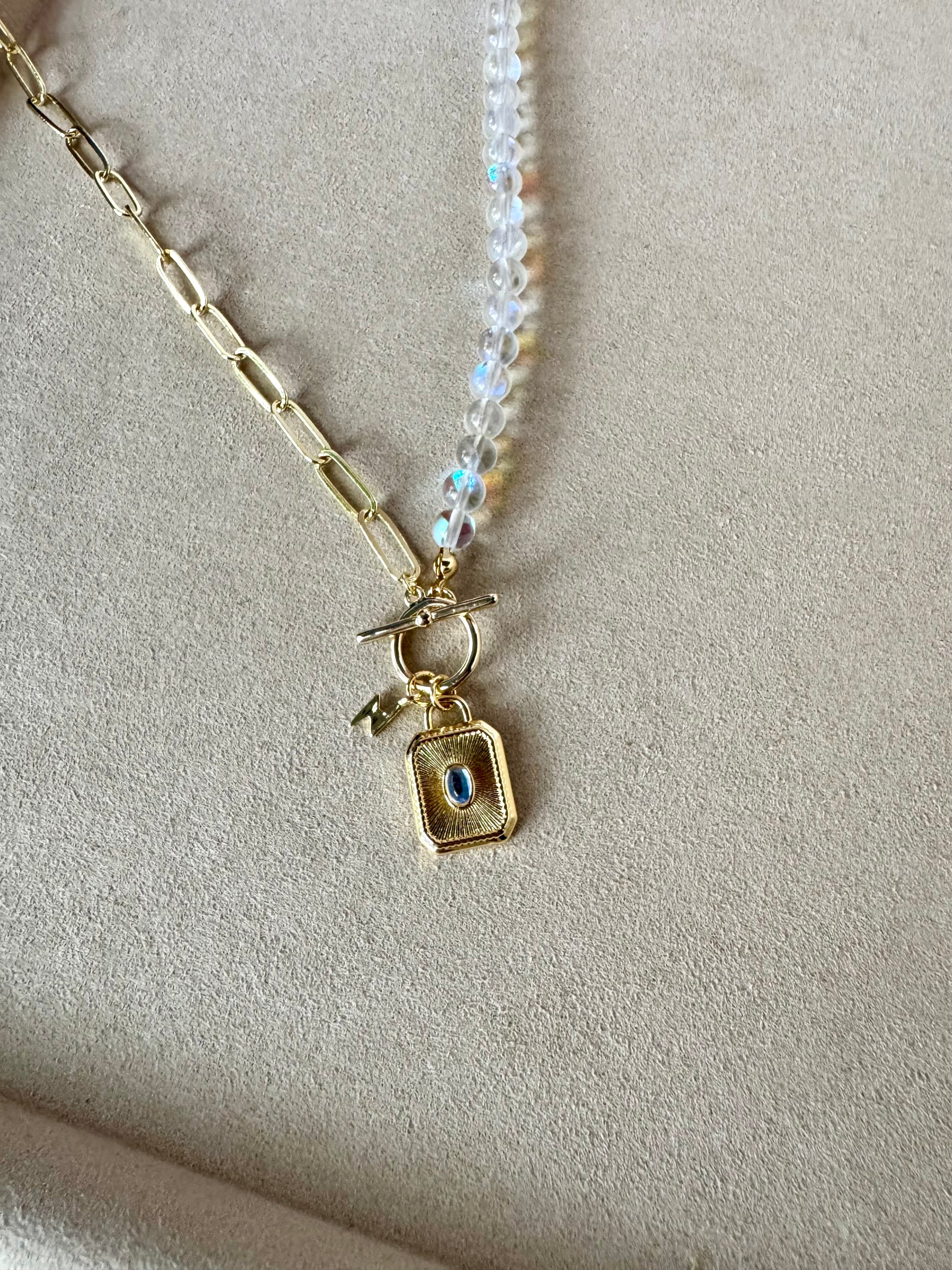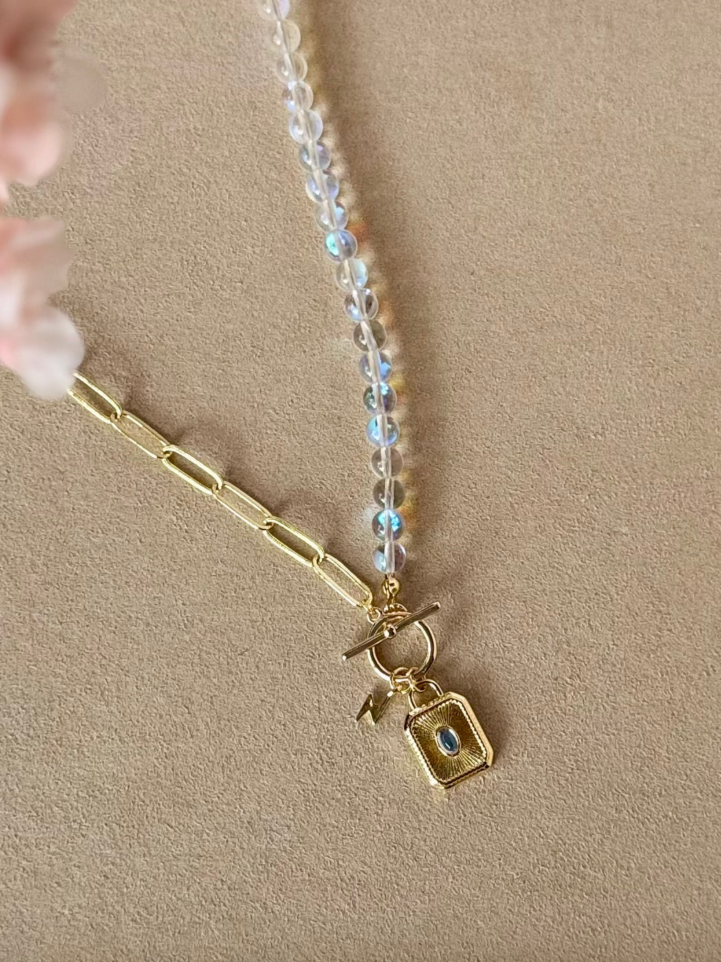 Elevate your style and inner energy with Aura. Each bead and pendant is crafted with stunning mermaid glass, capturing and reflecting light for a peaceful and chic experience. With a bold gold chain, this necklace is perfect for those who believe in the power of beauty and positivity.